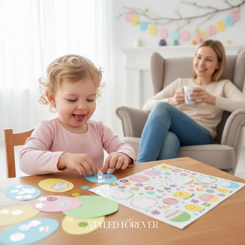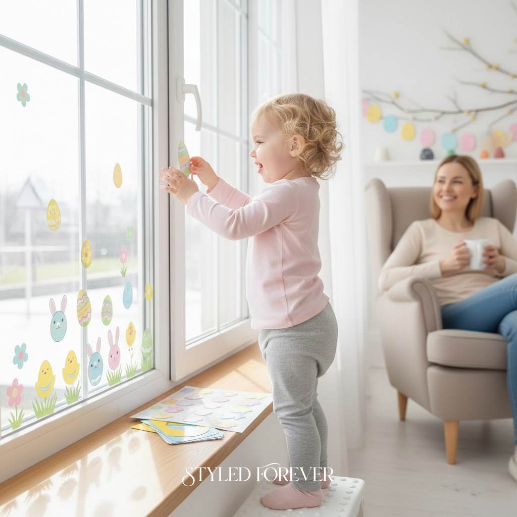 Window clings are such a secret weapon. Toddlers decorate windows with eggs and bunnies—no residue, no cleanup. It brightens the room instantly and feels very springy. You’ll love how controlled this activity is while still letting them go wild creatively. Plus, guests will notice—just saying!