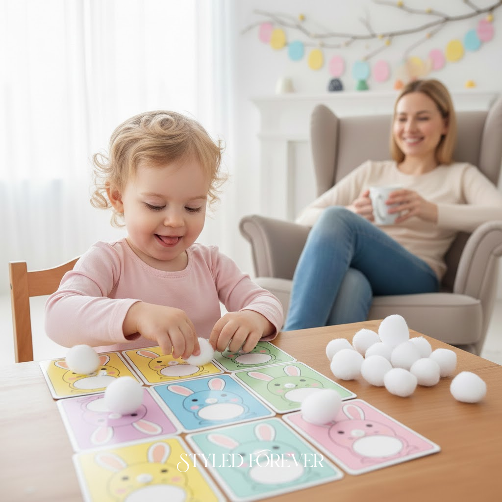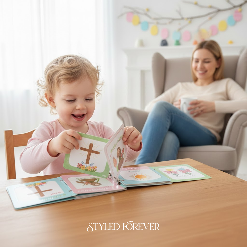 Use ring-bound cards with Easter images. Toddlers flip through and tell their own stories. No mess, lots of imagination. You’ll love listening to their little narratives—it’s sweet, calm, and totally heart-melting.