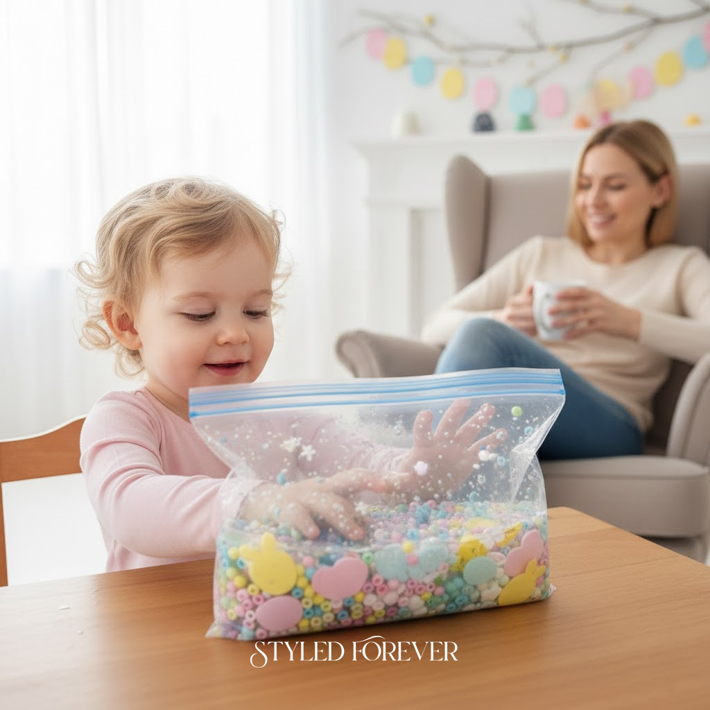 Seal pastel beads, foam shapes, and confetti inside a zip bag. Toddlers squish, point, and explore—without anything spilling. It’s calming and keeps hands busy. You’ll love how quiet this activity is. Perfect for when you need five minutes to breathe—or scroll wedding inspo.