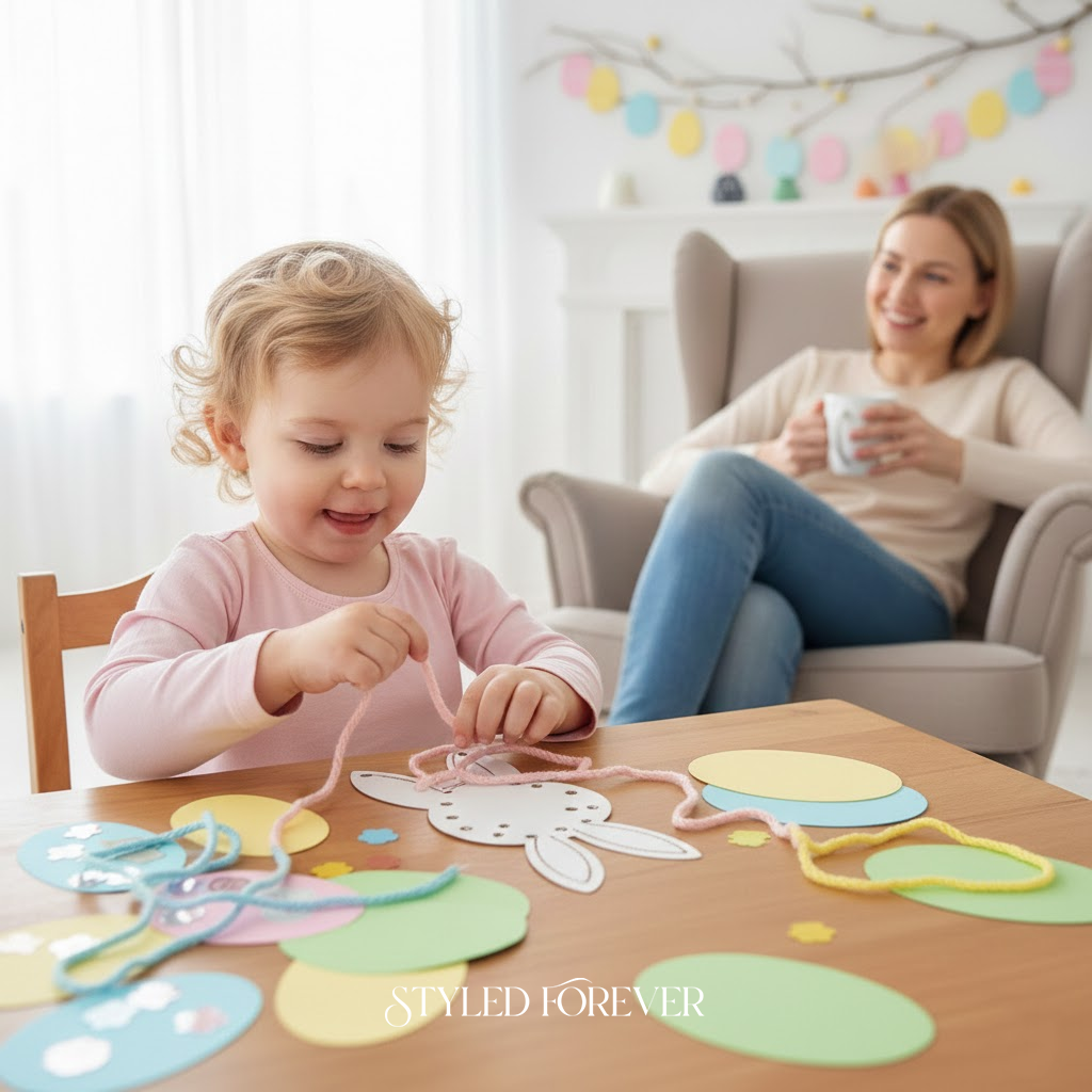 Punch holes in bunny shapes and add thick laces. Toddlers thread through at their own pace. No mess, lots of focus. It feels structured and thoughtful—like a well-planned seating chart. You’ll love how this builds skills while still being fun.