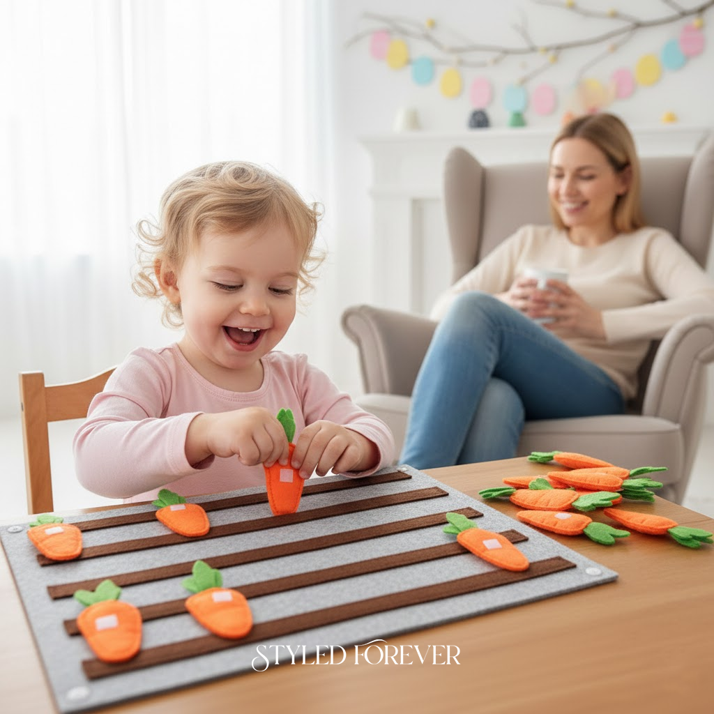 Felt carrots with Velcro tops that toddlers “harvest.” It’s interactive and totally mess-free. They pull, stick, repeat. You’ll love how engaged they get—and how tidy it stays. This one’s a crowd-pleaser for sure.