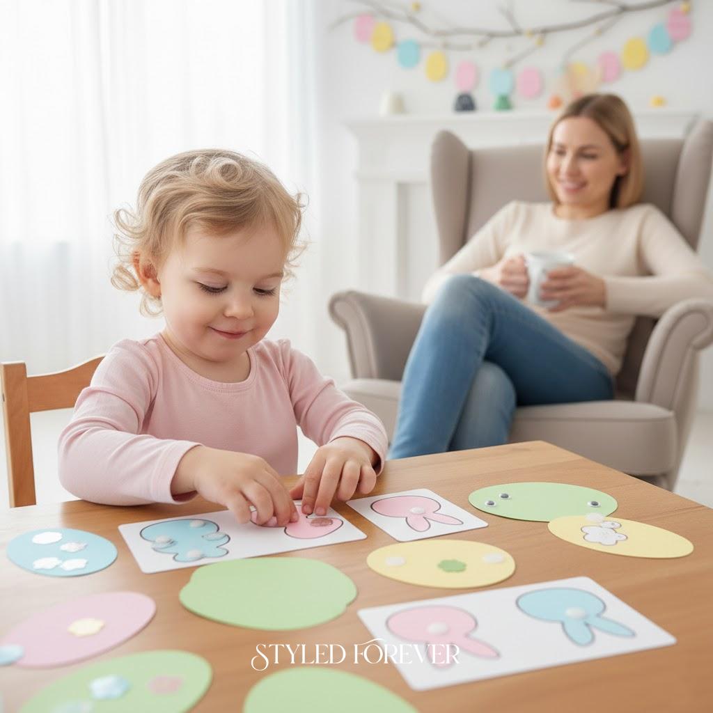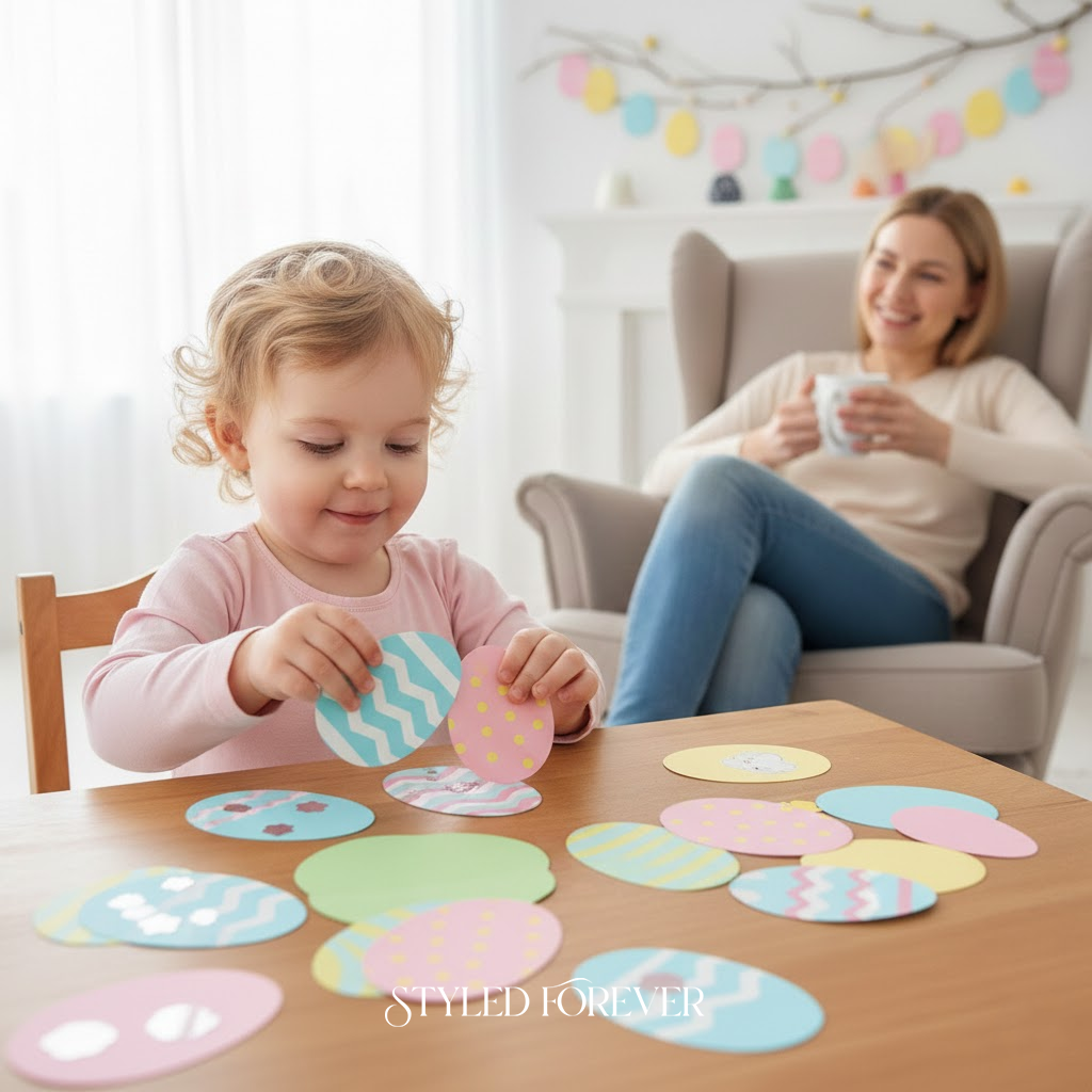 Cut paper eggs into two pieces with patterns. Toddlers match halves back together. It’s quiet, clean, and surprisingly satisfying. You’ll love how calm this activity feels—perfect for winding down before dinner.