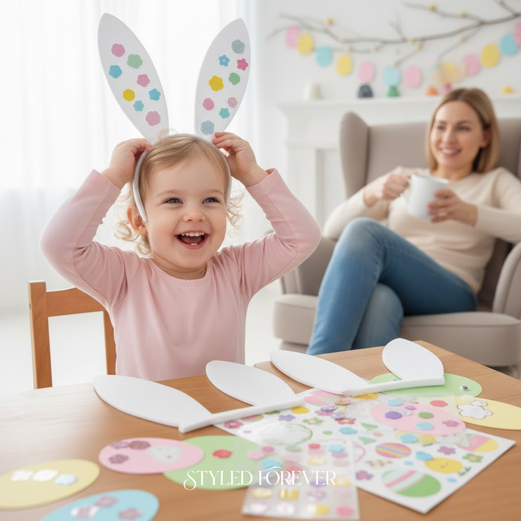 Okay, this one gives flower-girl vibes and I’m obsessed! Use pre-cut foam ears and a simple headband with peel-and-stick dots. Toddlers decorate, then immediately want to wear them—which is adorable chaos in the best way. No scissors, no glue, no cleanup. Just giggles and hopping around the house. You’ll want photos—trust me, this is scrapbook material.