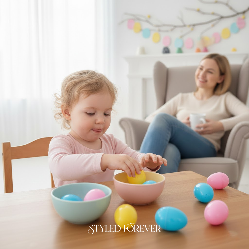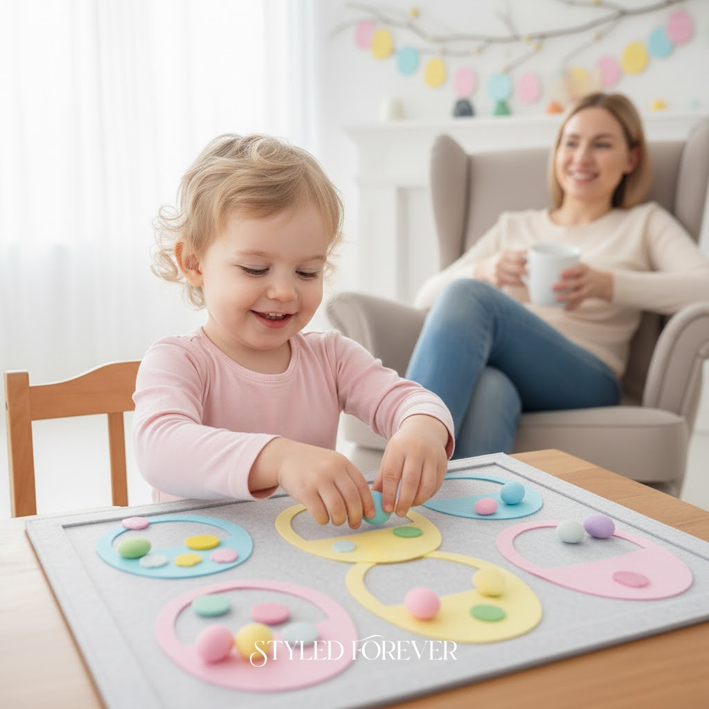 Felt is such a mom win—it’s soft, quiet, and stays put. Use a felt board or tray with felt eggs and baskets. Toddlers “fill” baskets without anything rolling away. It feels intentional and calm, like a styled wedding flat-lay. You can even guide colors or patterns. You’ll love how relaxed this activity feels—and how long it keeps them busy.
