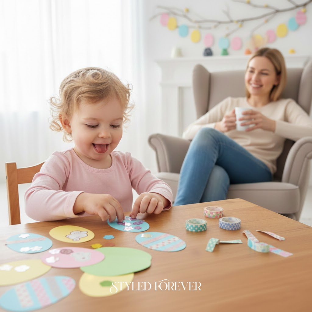 Washi tape is basically the washi of crafting—clean, pretty, and zero mess. Give toddlers egg cutouts and short tape strips. They press, peel, repeat. The designs turn out playful and fun without any help. It’s creative freedom without the stress. You’ll love how easy this is to set up—perfect for last-minute Easter plans.