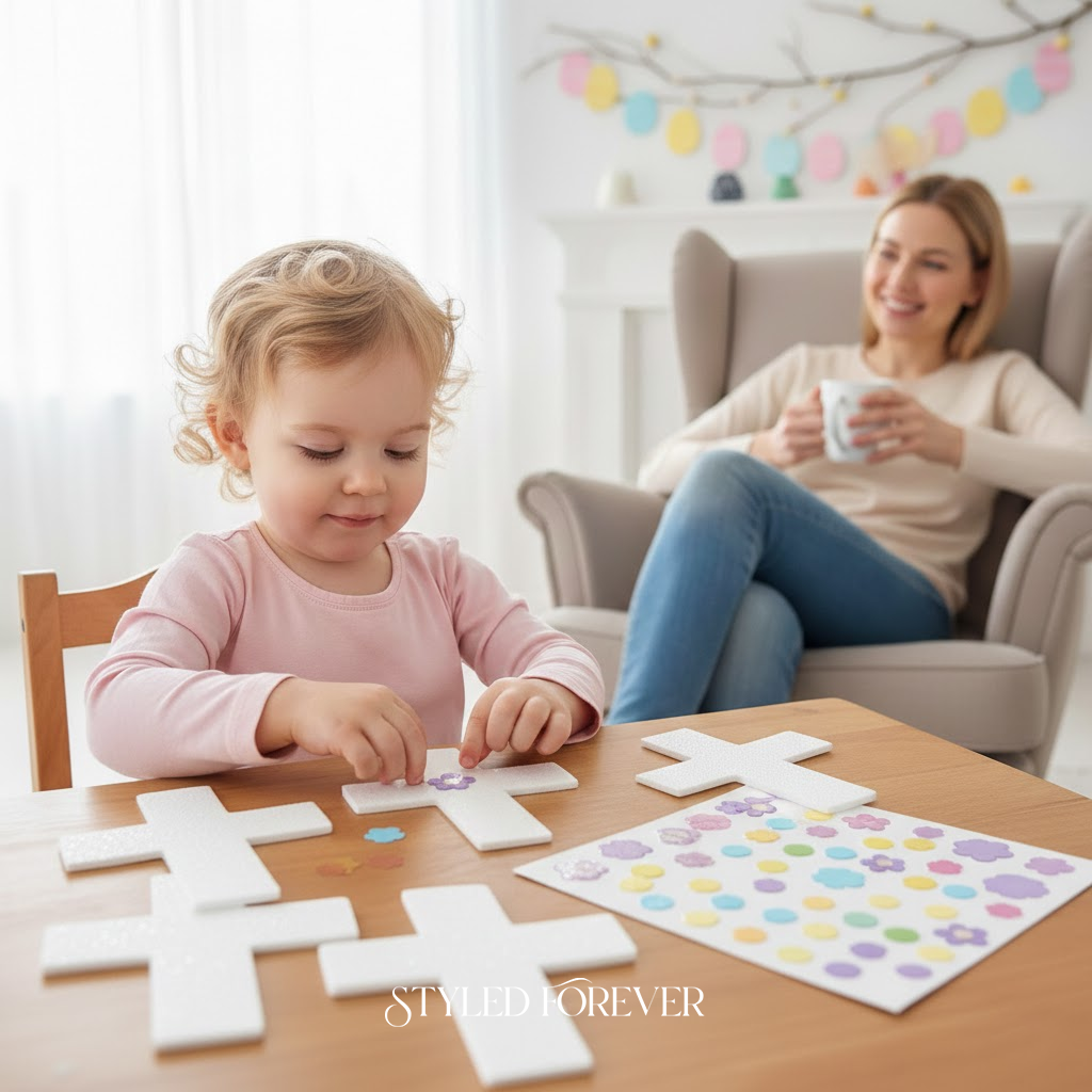 Simple and meaningful without being overwhelming. Use foam cross shapes and peel-and-stick decorations. Toddlers place pieces wherever they want, and it stays clean and calm. It’s a lovely way to talk about Easter while keeping things stress-free. You’ll appreciate how gentle this feels—perfect for a quiet afternoon.
