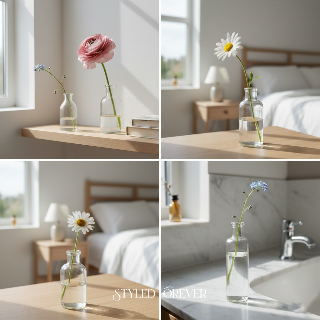 Instead of full arrangements, try single stems in small glass bottles. Spread them across a room—one on a shelf, one on a bedside table, one in the bathroom. The repetition creates calm. Choose flowers with simple shapes and muted tones. The space around each stem matters as much as the flower itself.