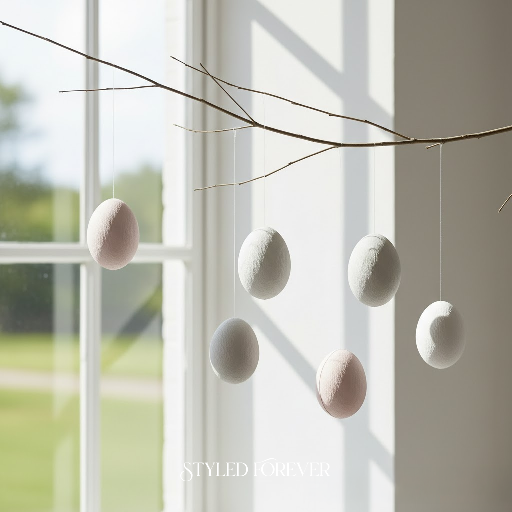 Lightweight paper eggs, hung from thin thread, move softly with air. Suspend them near a window or from a simple branch indoors. Keep the palette minimal—white, soft grey, faint blush. The movement is barely there, but it changes the room. It feels dreamy without being fragile.