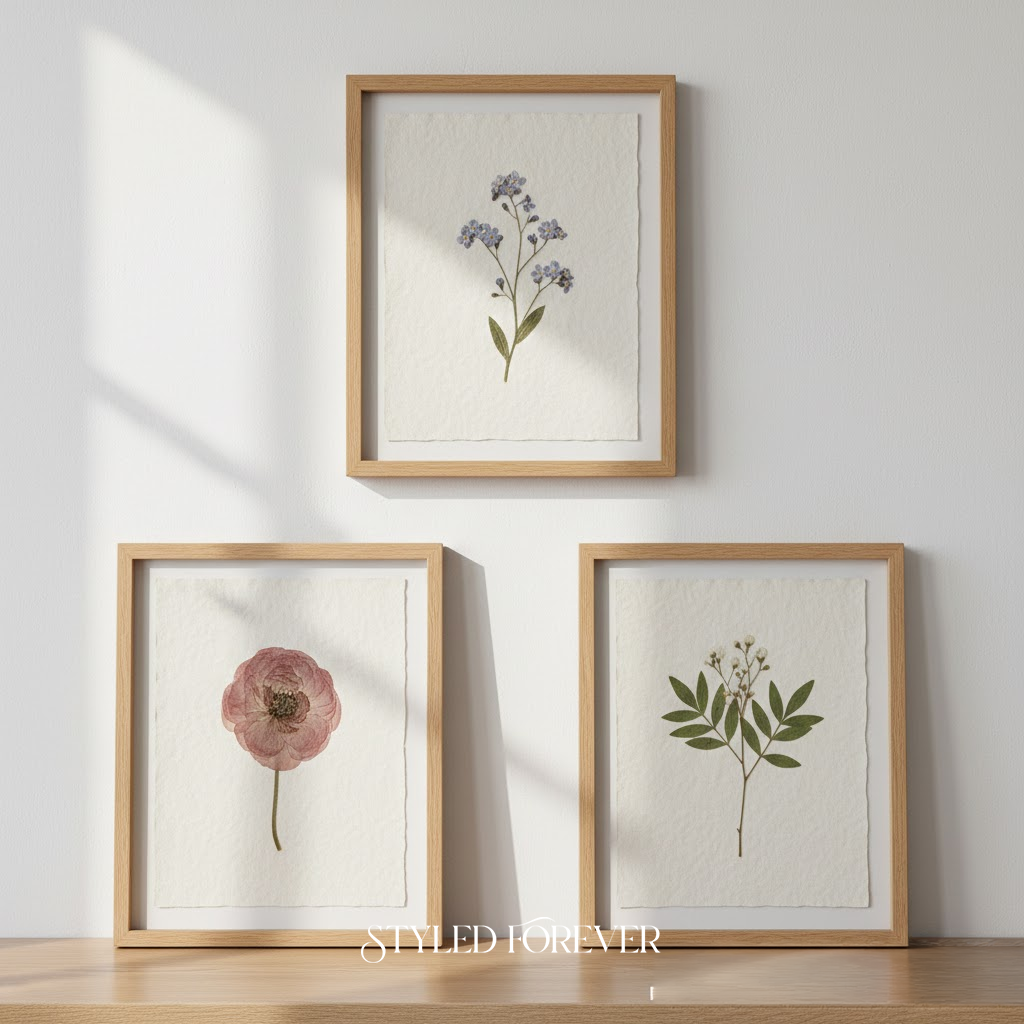 Pressed flowers bring spring indoors in a lasting way. Frame them in thin wooden frames with plenty of space around the stem. Hang them at eye level, or lean them against a wall. This decoration feels thoughtful and slow. It invites you to look closely. It holds the memory of spring rather than the moment.