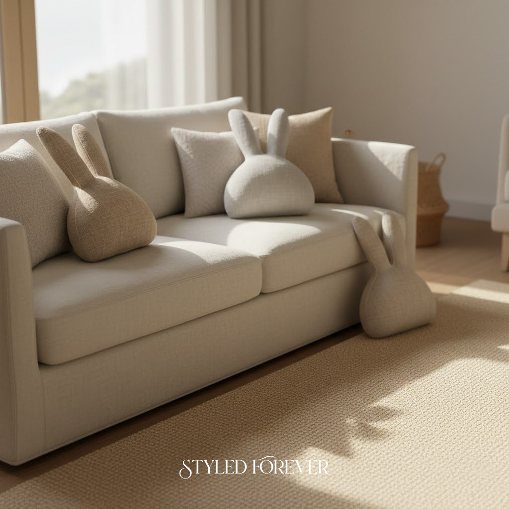 A pillow shaped like a bunny can feel playful without feeling childish. Choose linen or cotton in soft neutral shades. Let the shape be simple, almost abstract. Place it on a chair or bed where it feels natural. This detail brings warmth and a quiet sense of joy, especially in shared spaces.