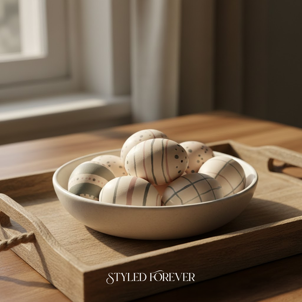 A shallow ceramic bowl filled with eggs in muted tones—linen white, soft clay, pale sand. Nothing glossy. Nothing loud. Let them rest naturally, uneven and imperfect. Place the bowl where light touches it in the morning. The effect is subtle and grounding, like a still life you live beside. This works best when the table is mostly bare—wood grain visible, space allowed. It feels calm. It feels intentional. It asks for nothing more.