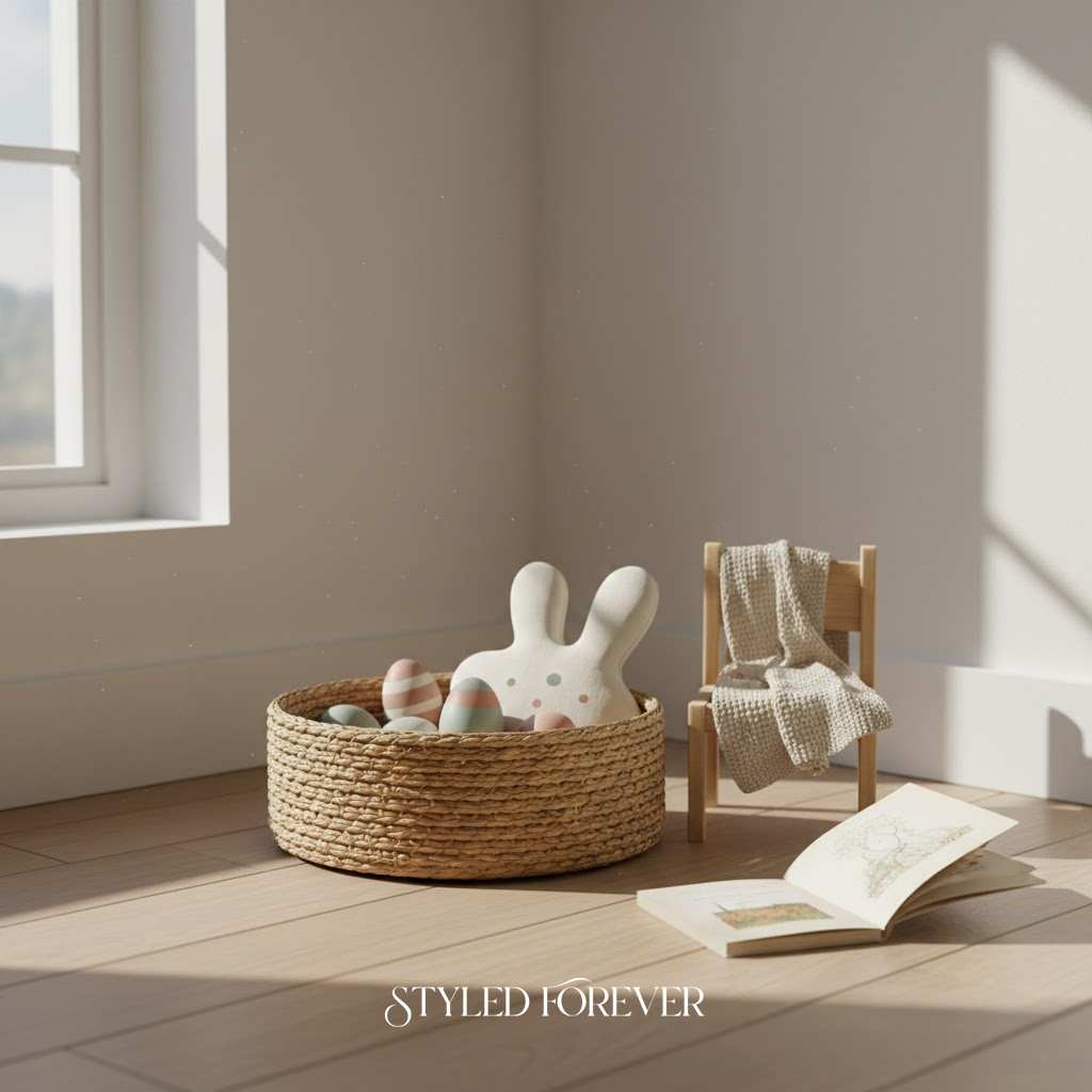 If there are children in your home, create a small Easter corner just for them. A low basket, a soft bunny, a few eggs. Keep it simple. This space feels inviting without overwhelm. It becomes a place to pause, to sit, to notice. Play does not need noise to be meaningful.