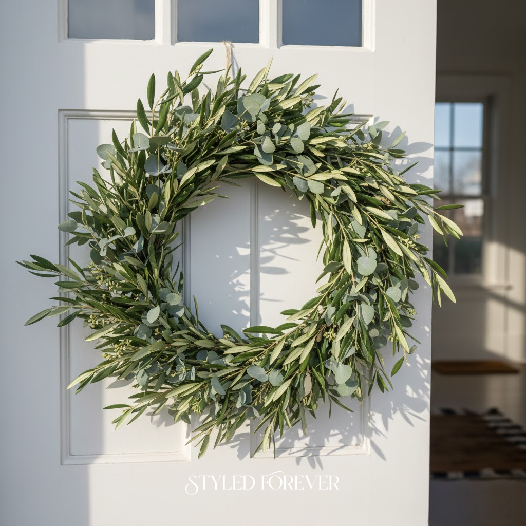 A wreath does not need flowers. Simple greenery—olive branches, eucalyptus, soft leaves—creates a calm welcome. Keep the shape loose. Hang it where it can be seen but not announced. This kind of decoration blends into daily life, becoming part of the home rather than a statement.