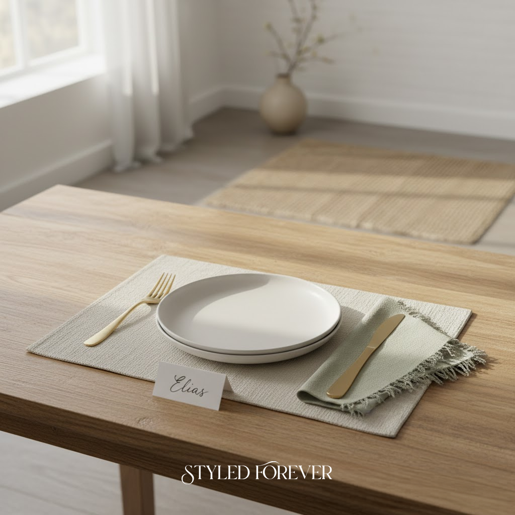 A folded piece of textured paper. A name written slowly. Nothing more. Place cards can be a moment of care for your guests, even if the gathering is small. The handwriting matters more than the design. Let it be imperfect. Let it feel human. This detail sits quietly on the table, reminding everyone to slow down.