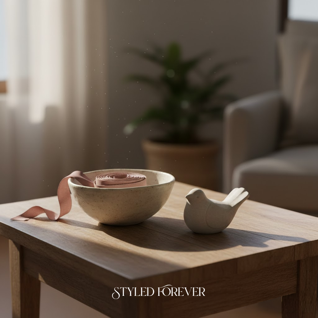 Choose one piece that matters to you—a handmade bowl, a faded ribbon, a small sculpture. Let it represent the season in your own way. This object becomes the heart of your decoration. It is quiet, personal, and enough.