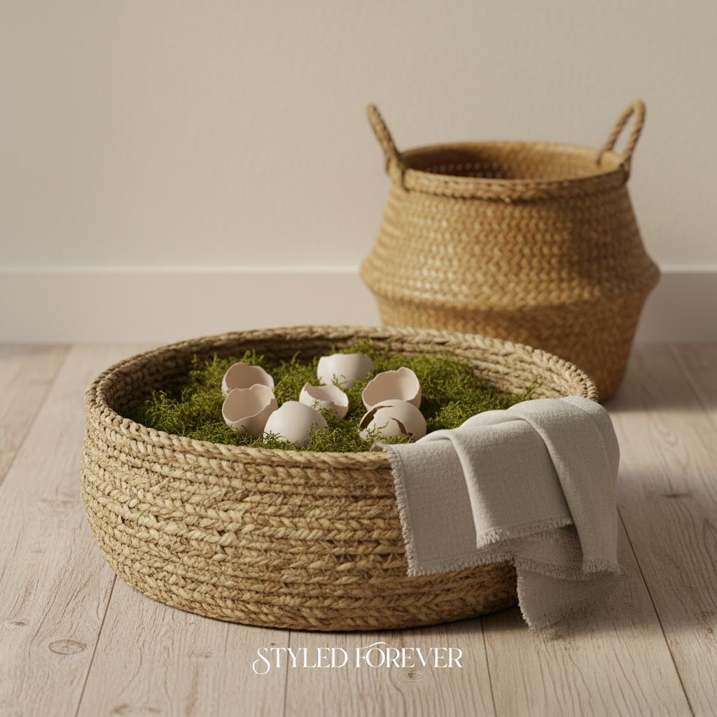 A simple basket can hold more than objects—it holds mood. Fill one with eggshells, moss, or folded linen napkins. Another can sit empty, simply resting against a wall. The weave brings warmth without drawing attention. Choose baskets that feel soft to the eye, slightly worn, slightly uneven. They suggest care rather than decoration. They feel grounded and human.