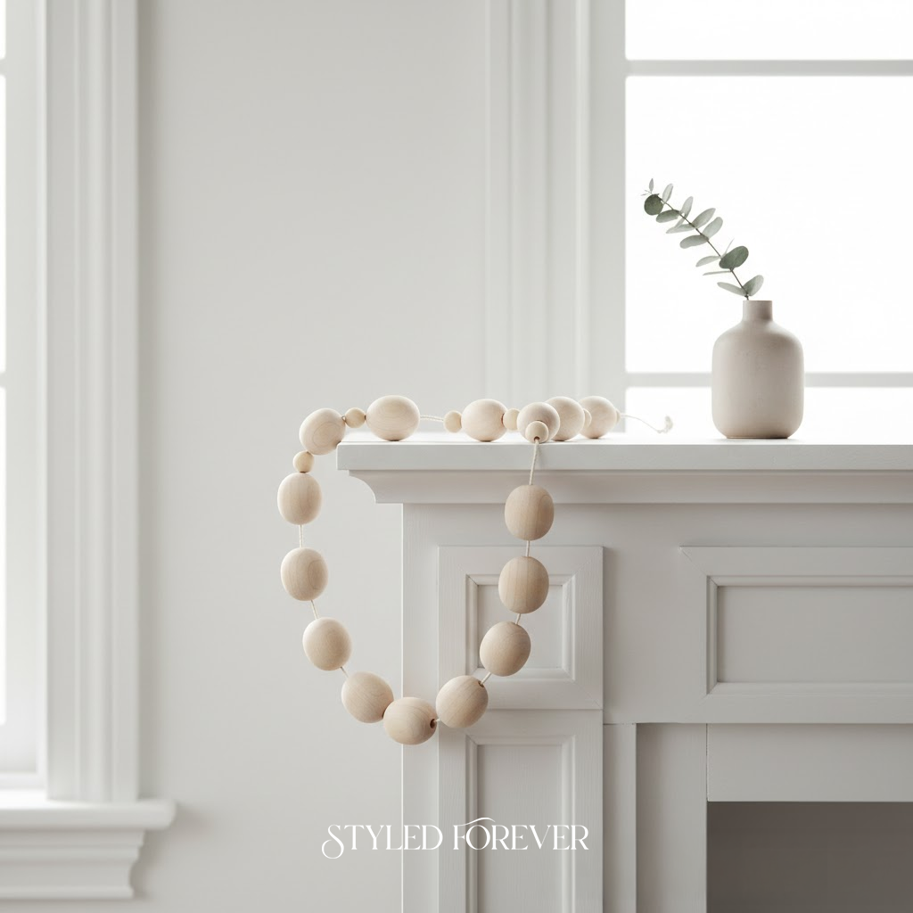 A strand of wooden eggs, unfinished and pale, adds gentle rhythm to a space. Drape it across a mantel or along a shelf edge. The movement is quiet, almost unnoticed, but it softens hard lines. Wood brings warmth without color. It works especially well in rooms with white walls and natural light. The garland becomes part of the architecture rather than an accent.