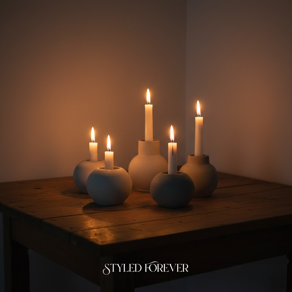 As the day fades, candlelight becomes the decoration. Choose stoneware holders with simple forms—rounded, heavy, grounded. White or soft grey works best. Light a few at dusk and let shadows move across the room. There is no need for scent. The warmth of the flame is enough. This kind of decoration lives in time, not space.