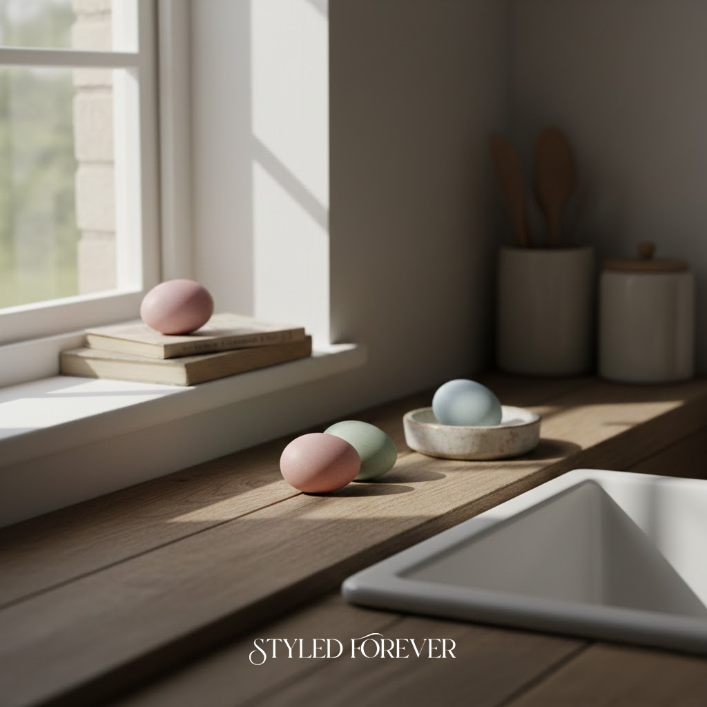 Not everything needs to be centered. Place a few pastel eggs on a windowsill, beside a stack of books, or near the sink. Choose colors that feel washed and quiet—dusty pink, pale blue, soft sage. These small moments feel discovered rather than styled. They create a sense of ease, like details you stumble upon slowly.