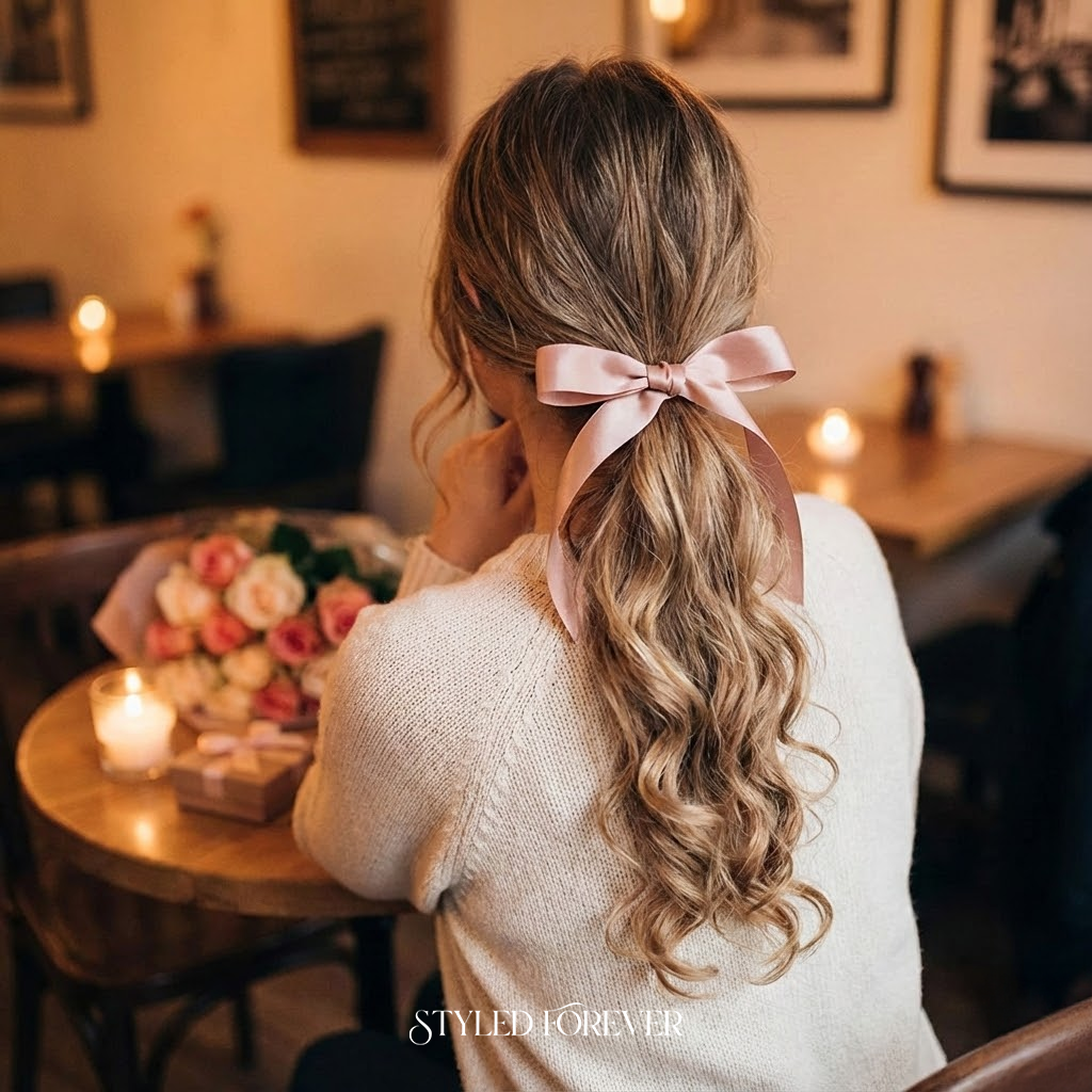 A ponytail becomes an instant Valentine icon with a simple satin ribbon. The look is sweet, polished, and full of quiet romance. Soft waves at the ends add motion, while the ribbon gives a whisper of charm without trying too hard. Perfect for a date, a dinner, or any moment that needs gentle beauty.