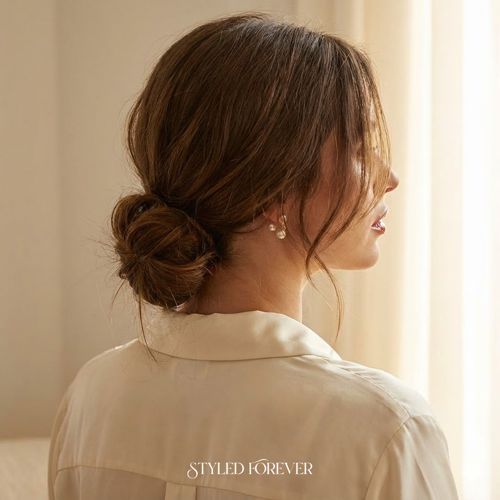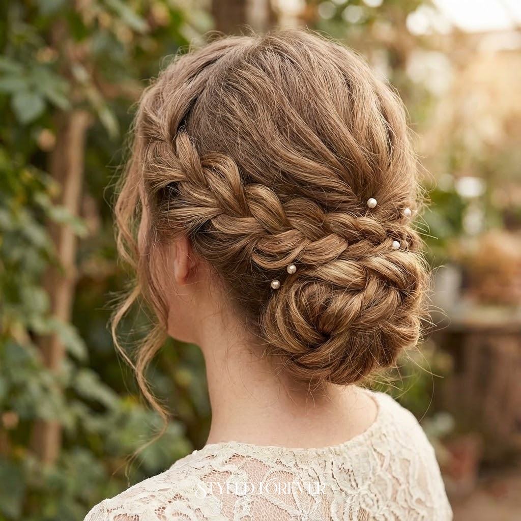 A braid wrapped into a bun creates texture and depth without fuss. It’s soft, secure, and carries a sweet elegance. This look works beautifully with dresses, tops, or any outfit needing a quiet, romantic hairstyle with subtle detail.