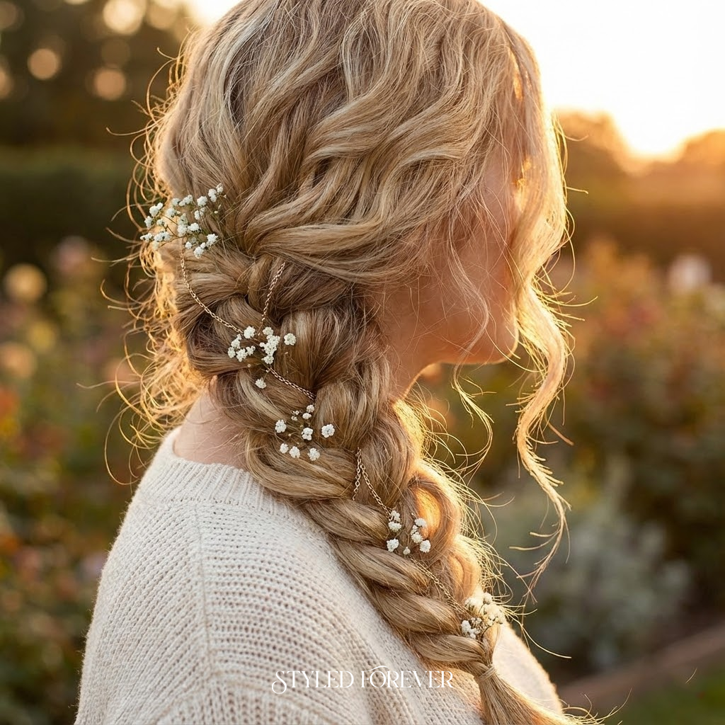 Pull your hair to one side and create a loose, flowing braid. It gives motion, softness, and a touch of storybook romance. Each strand catches the light beautifully, making this perfect for photos and date-night glow.