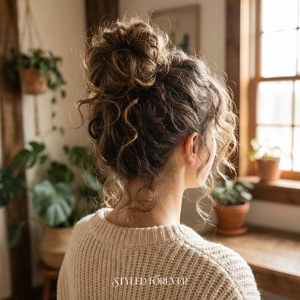 The classic messy bun gets a romantic update with face-framing curls. It’s relaxed but still gorgeous. This hairstyle carries that effortless, I-just-threw-this-up beauty that works for daytime dates or cozy nights.