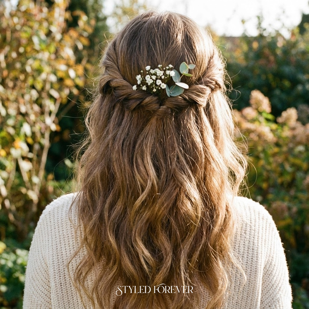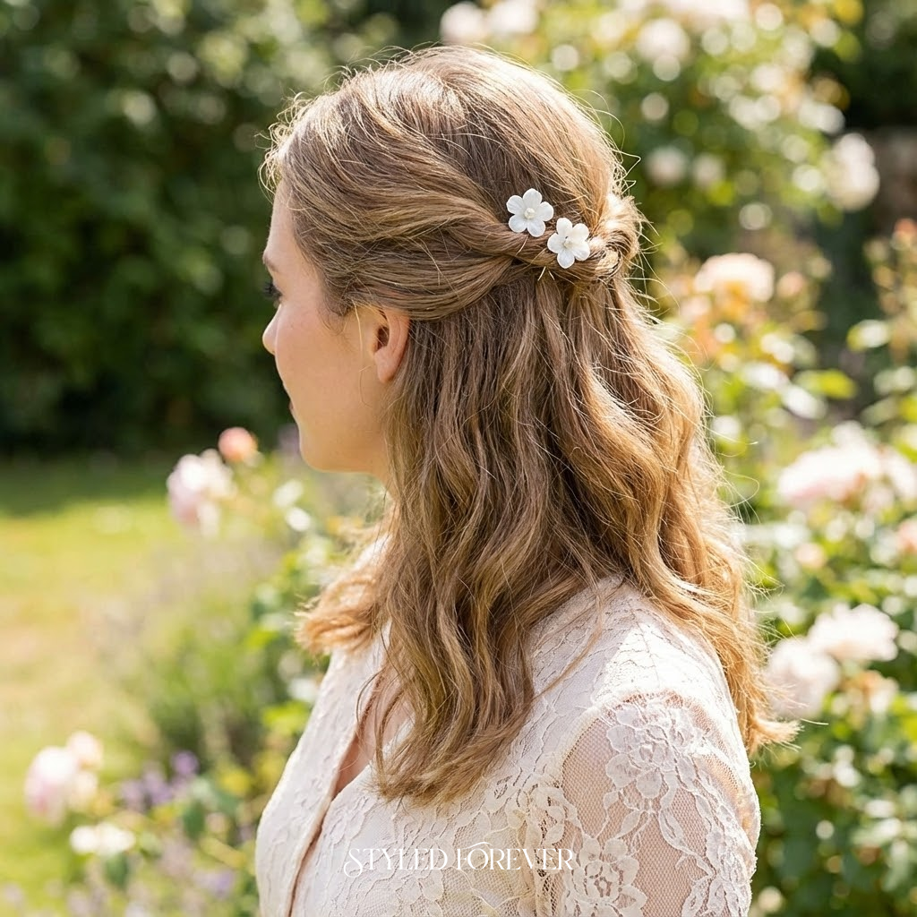 21. Floral-Accented Half-Up Style