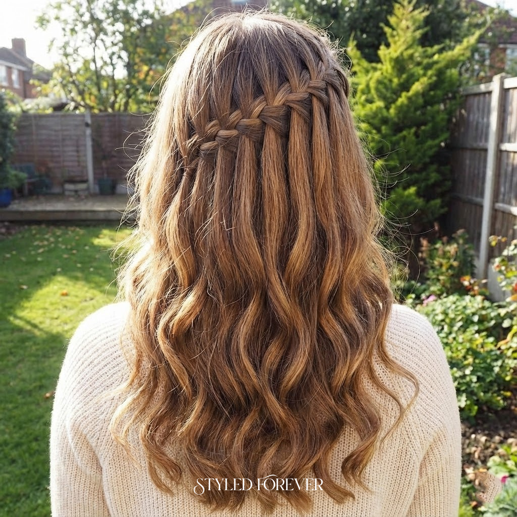 The waterfall braid drapes beautifully across soft waves, creating movement and gentle elegance. It’s a hairstyle that feels like poetry—perfect for anyone who loves delicate beauty with a little flair.