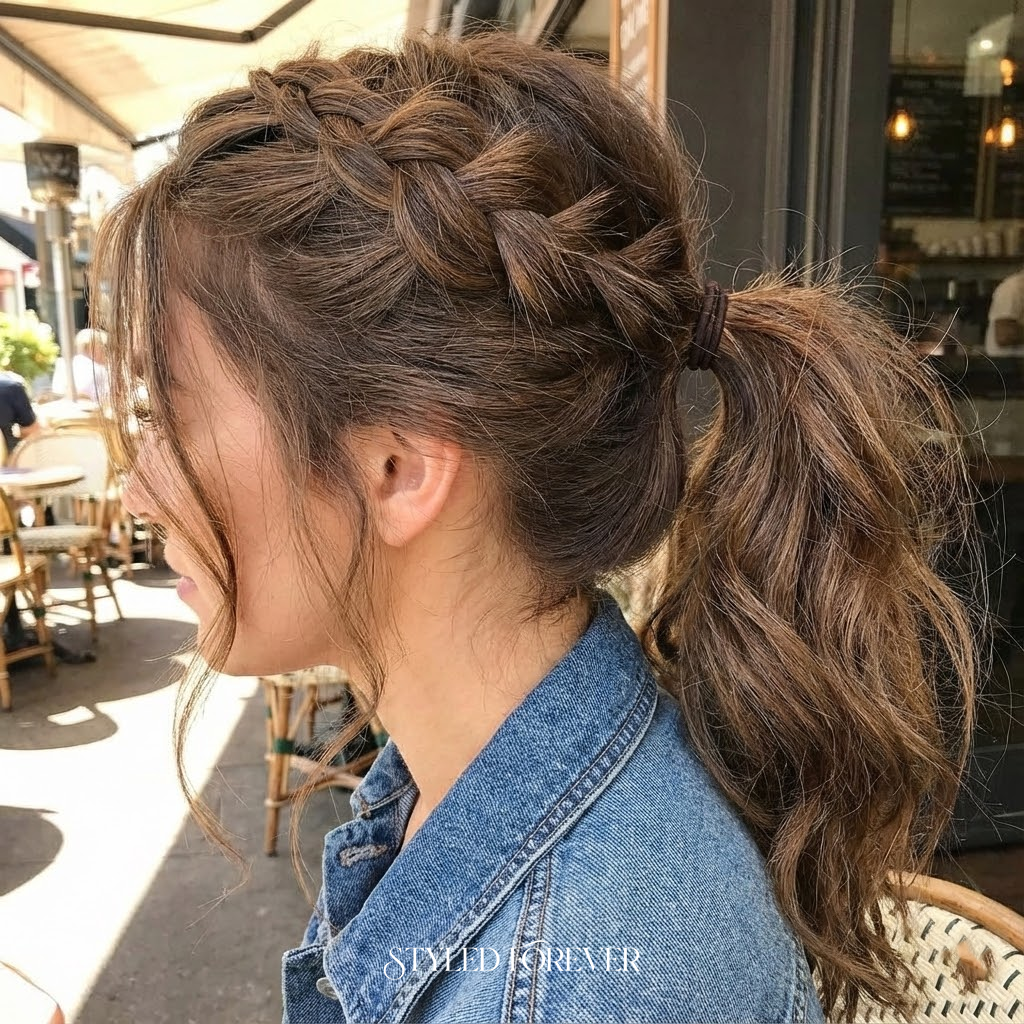 Braid the top section and pull it into a ponytail for a cool, modern twist. It brings edge and romance together, making it perfect for anyone who loves fashion-forward styles with softness mixed in.