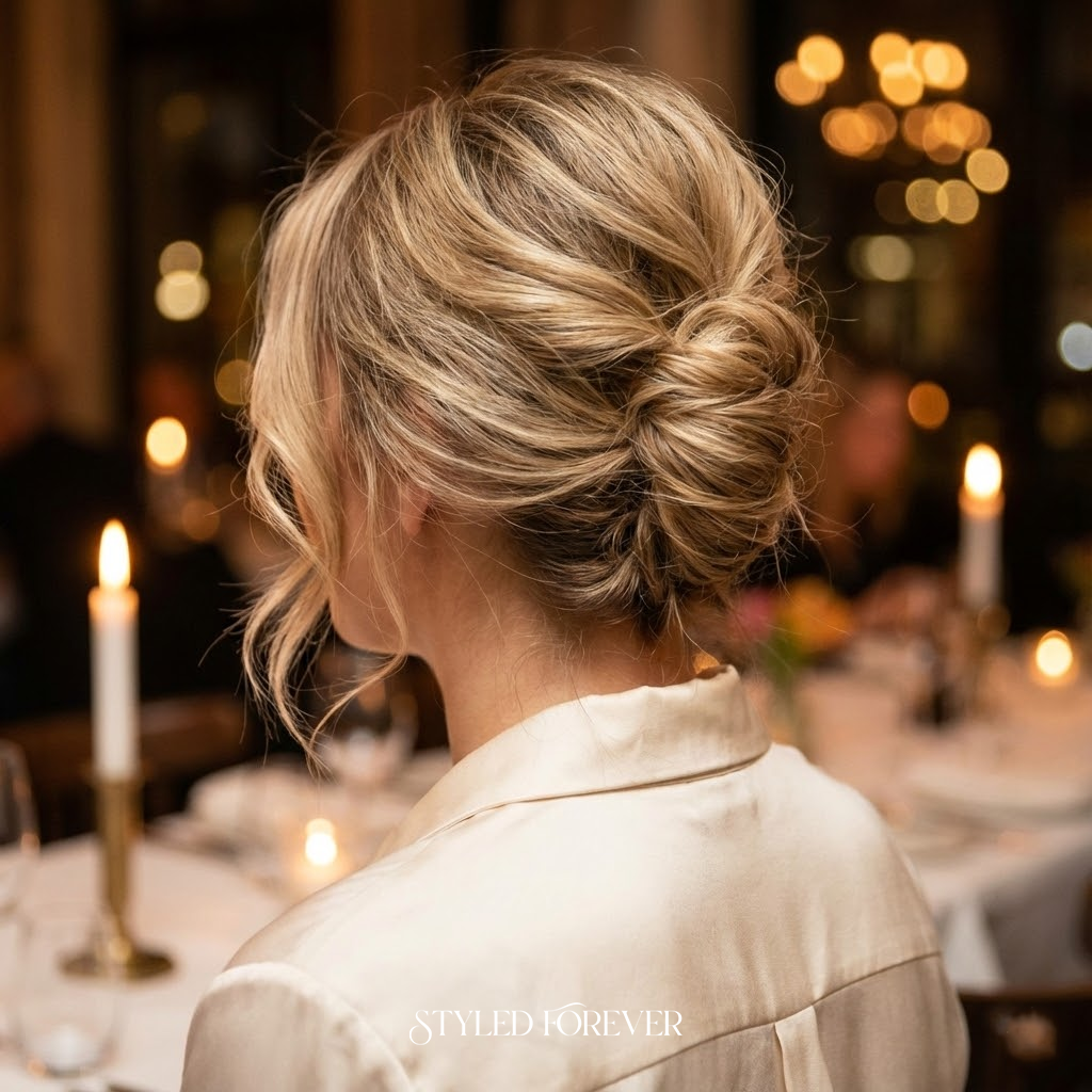 A classic French twist becomes more romantic when you leave it slightly undone. The softer edges bring movement, giving this iconic style a fresh, modern tone. It’s confident, pretty, and perfect for a night when you want your hair to whisper sophistication without stiffness.