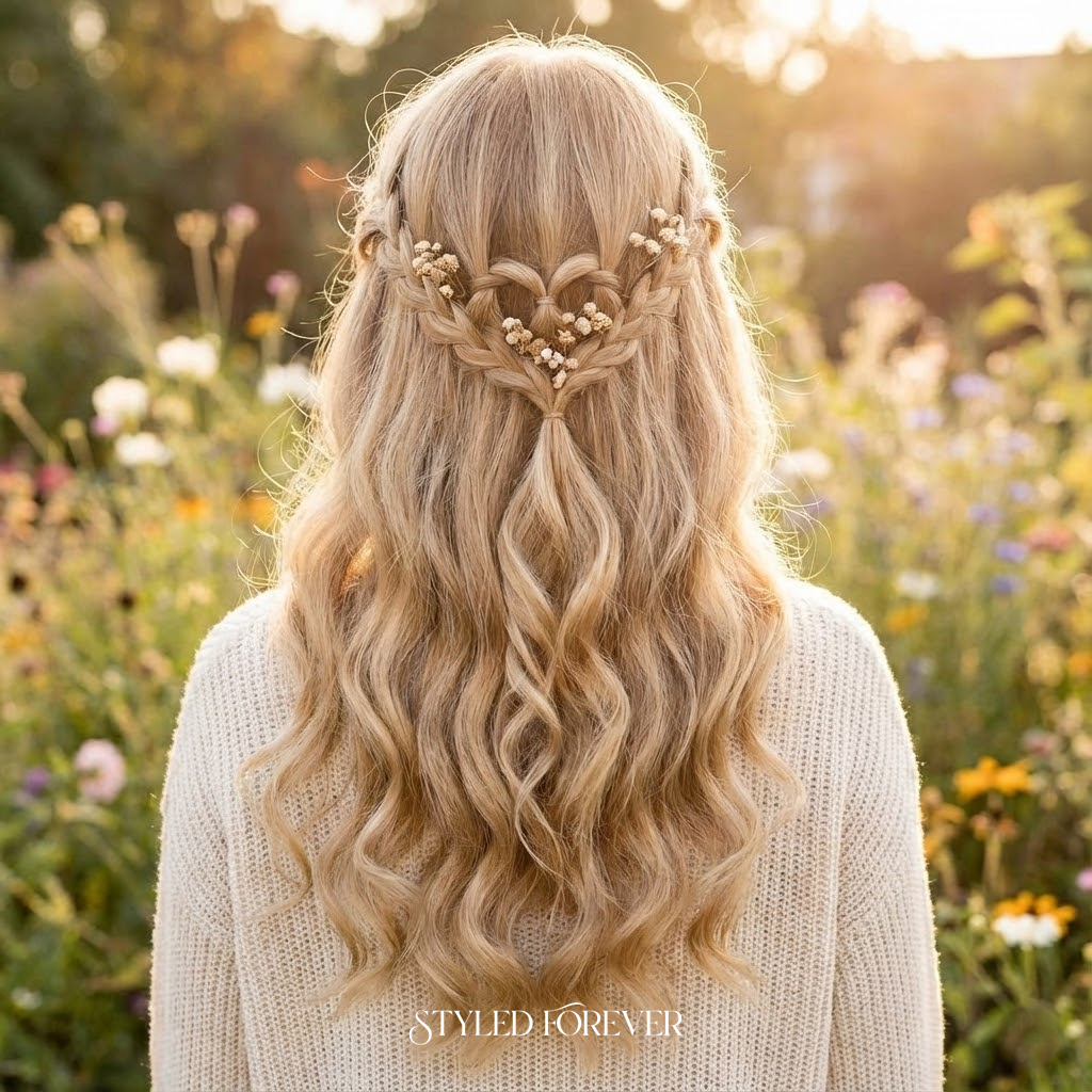 A simple braid shaped into a heart at the back adds such a sweet touch. It’s playful, dreamy, and perfect for younger girls or anyone wanting a cute, joyful style. Pair with loose curls and the whole look feels magical.