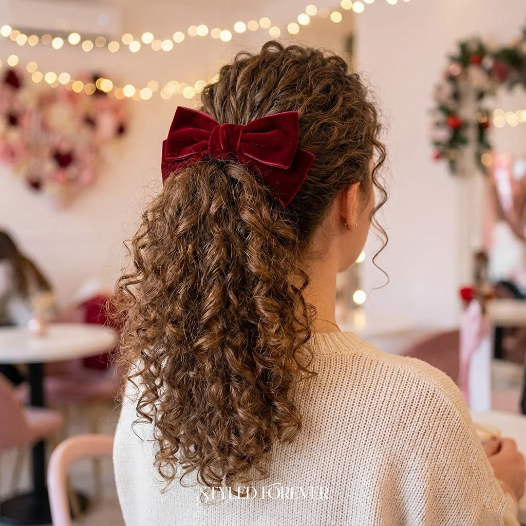 Bring the drama—but the soft, romantic kind. A high curly ponytail adds bounce, movement, and energy. It’s bold yet romantic, perfect for anyone whose personality shines bright. Add a bow or clip for extra Valentine’s flair.