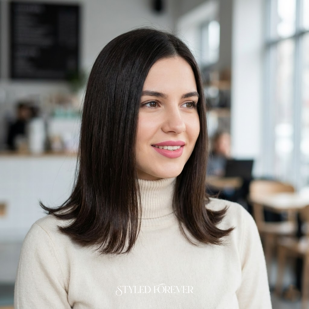 Super straight hair with a gentle flip at the ends feels modern and chic. It’s clean, polished, and perfect for Valentine’s dates that lean stylish rather than ultra-romantic. Add a pink lip and the whole look becomes effortless cool.