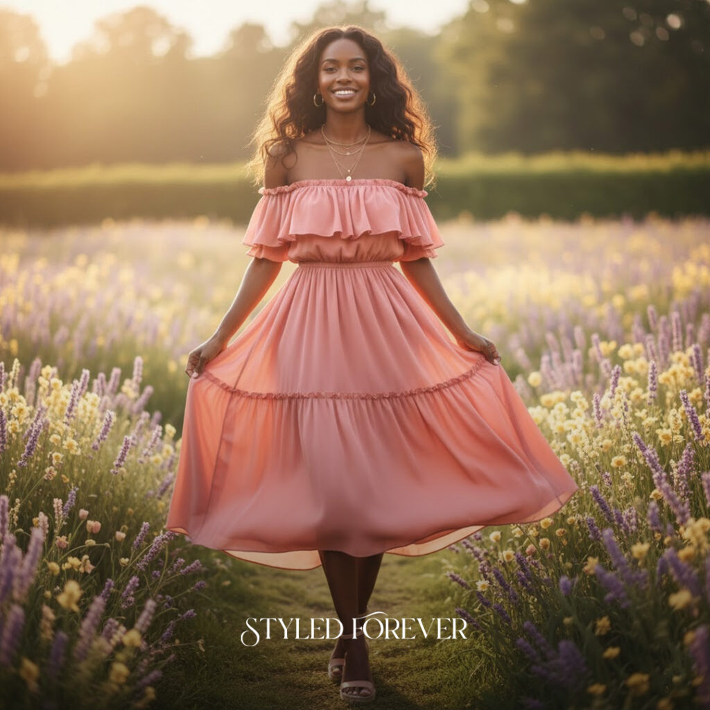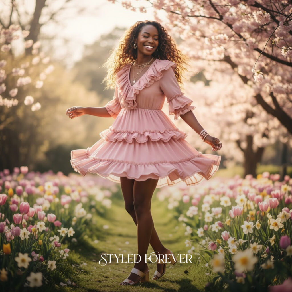 A tiered dress feels playful and light. Pair it with your natural hair out and glowing makeup. This look celebrates comfort and confidence. It’s easy, breezy, and perfect for spring.