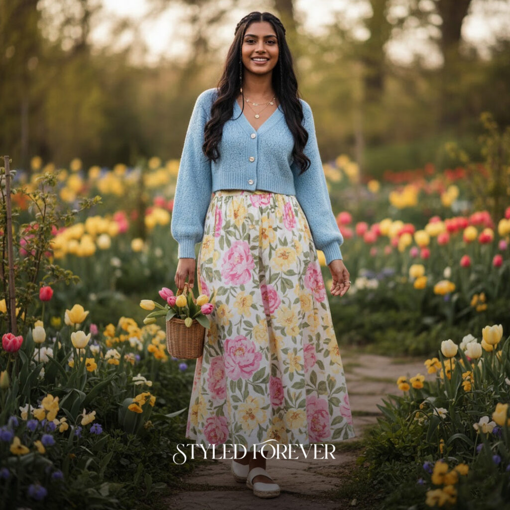 A maxi skirt paired with a cropped cardigan feels cozy but stylish. Choose light fabrics and spring colors. This look is great for unpredictable weather. You’ll love how comfortable yet cute this feels.