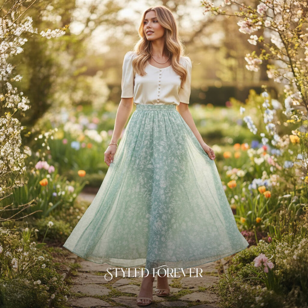 A high-waisted, flowy skirt paired with a fitted blouse creates the prettiest balance. Choose soft colors or subtle prints for Easter vibes. This outfit moves beautifully and feels feminine without being fussy. You’ll love how customizable this is—dress it up or down depending on the vibe.