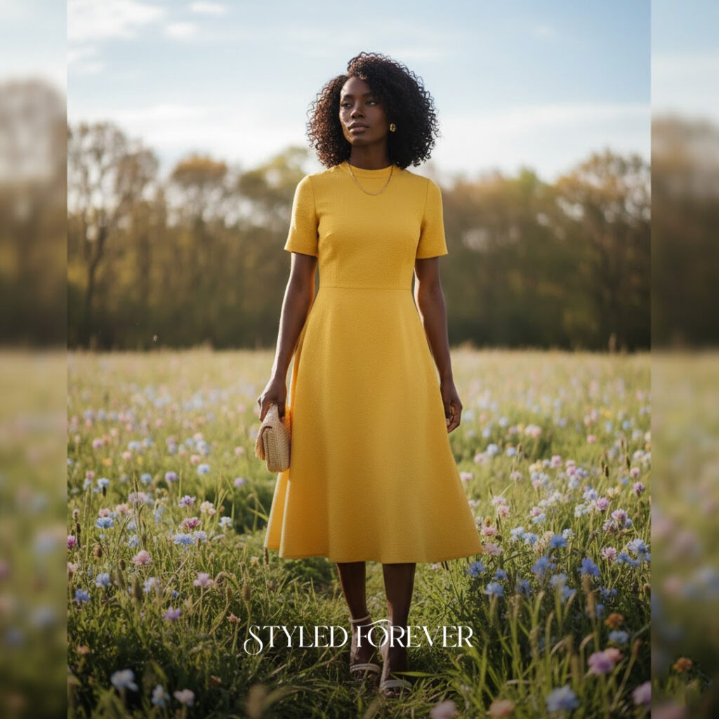 Yellow is such a power color for spring—and it glows on melanin. Choose a simple silhouette and keep accessories neutral. This outfit feels warm, cheerful, and confident. You’ll love how instantly happy this color makes you feel.