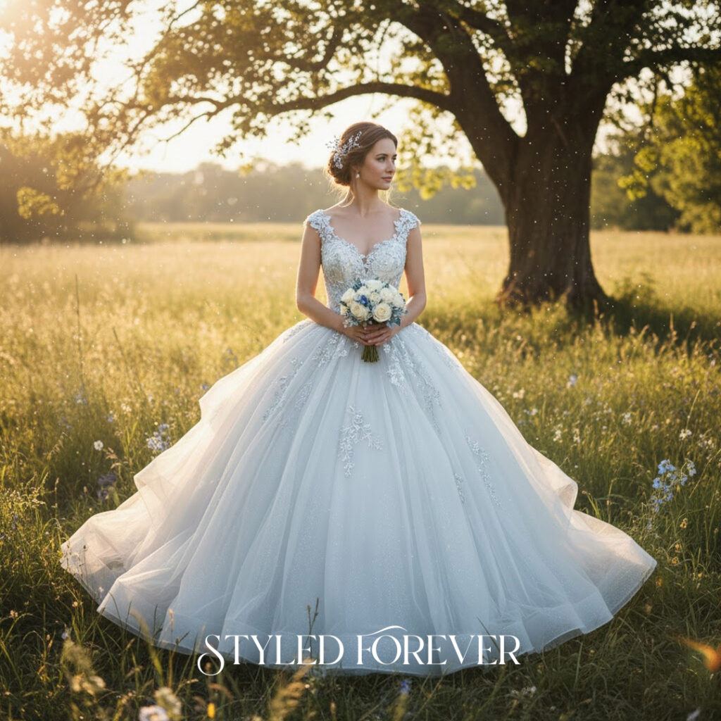 A faint blue organza overlay adds a quiet, ethereal mood. It feels peaceful—like morning light meeting soft fabric. This option suits brides who love gentle color with a fairytail spirit.