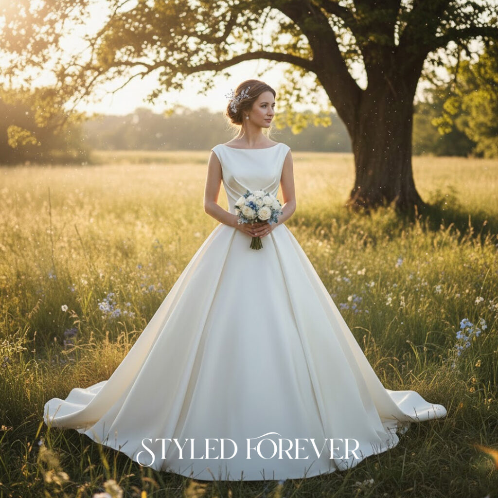 A smooth satin gown with subtle draping creates a fluid, calming effect. The softness of the fabric reflects light in a quiet way, offering a peaceful glow. This dress feels both minimal and royal—perfect for brides who want serene simplicity.