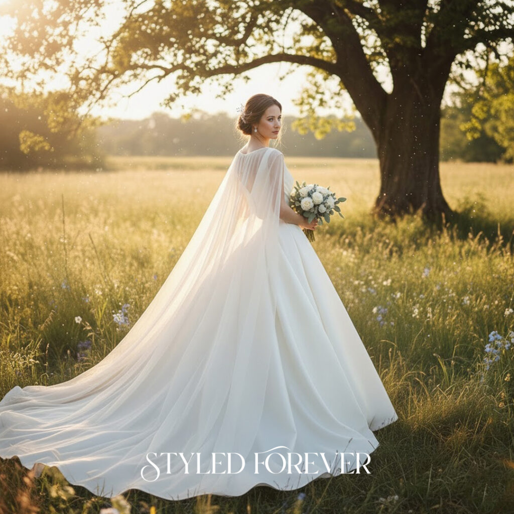 Instead of a veil, a light, sheer cape flowing behind you creates a magical, storylike feeling. It moves gently, catching the air with a soft sweep. The look is regal yet calm, giving you the presence of a fairytail heroine walking through her own scene.