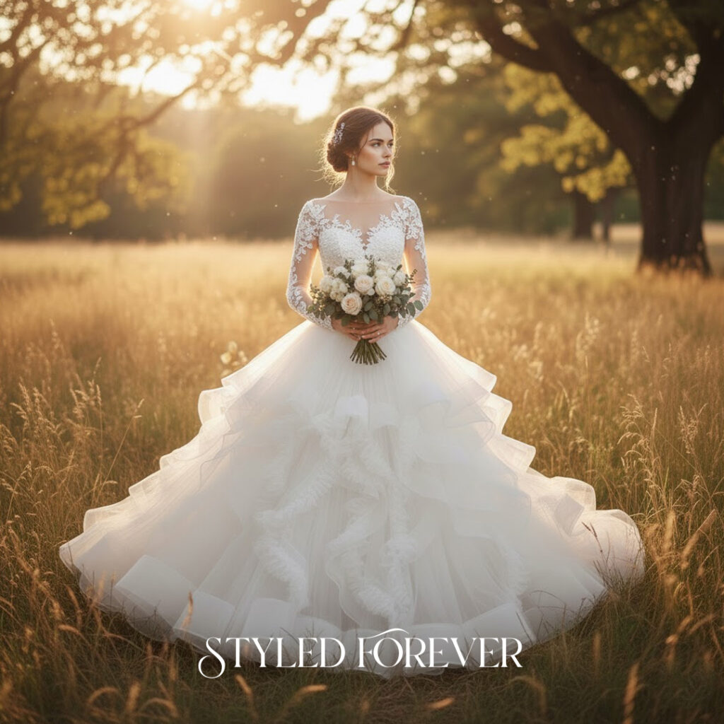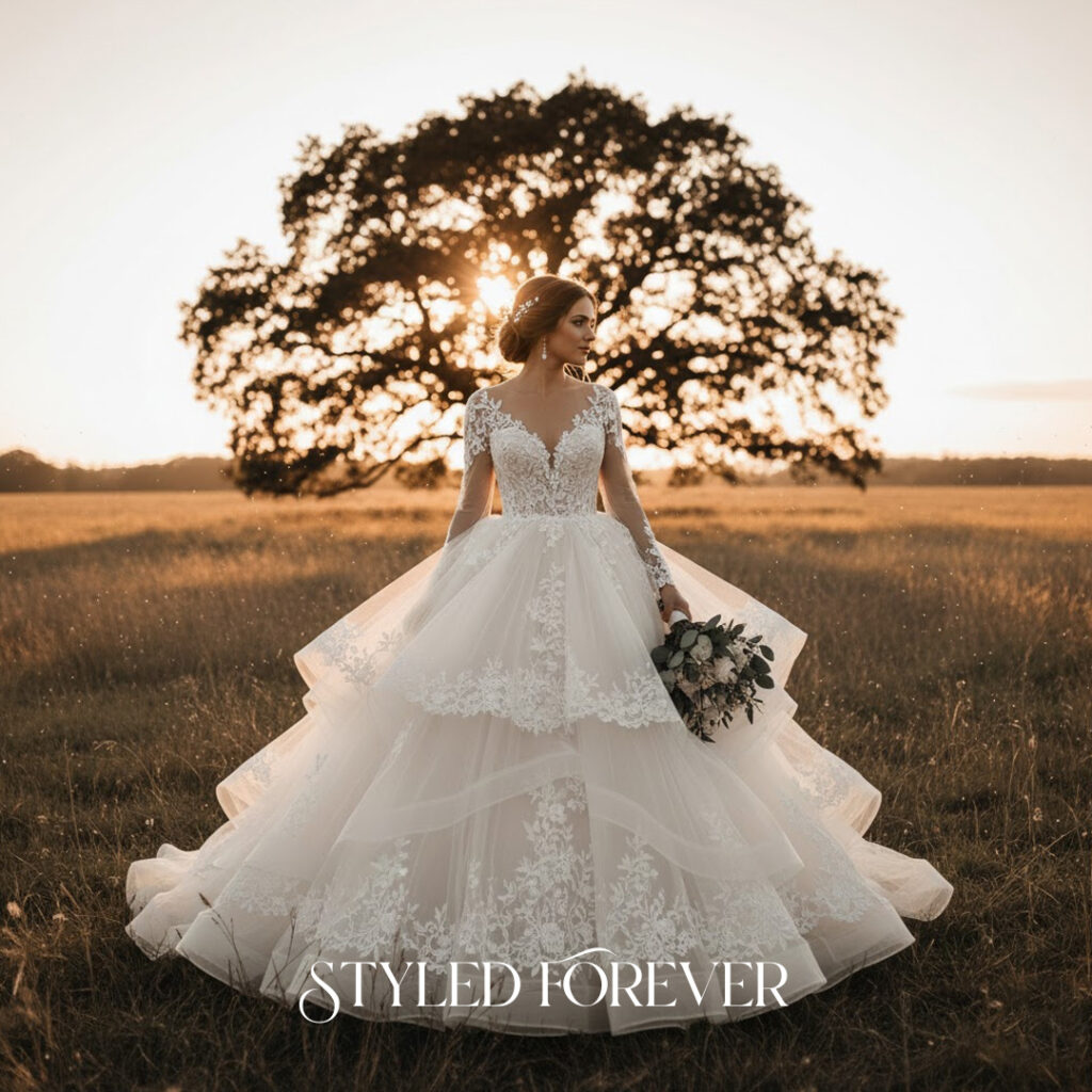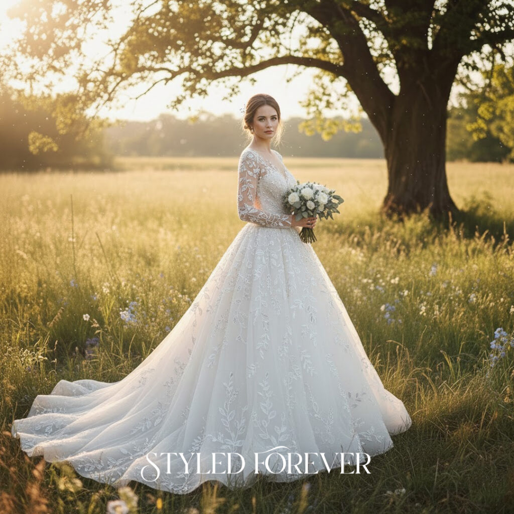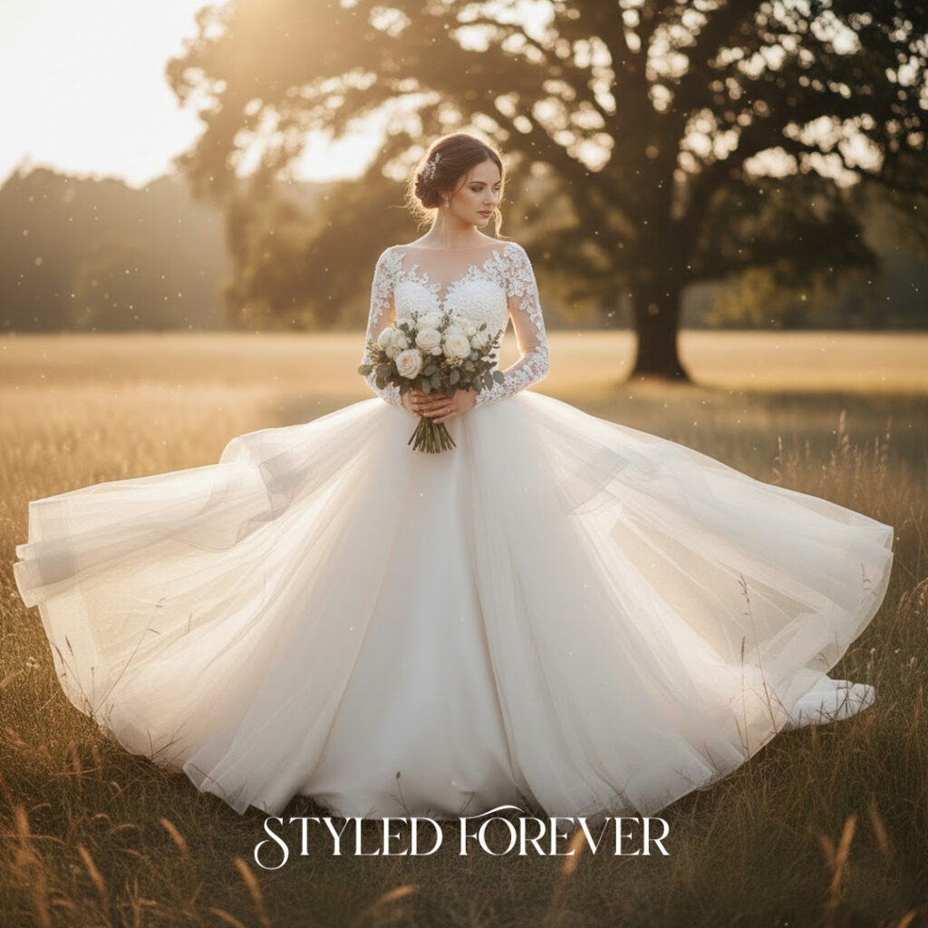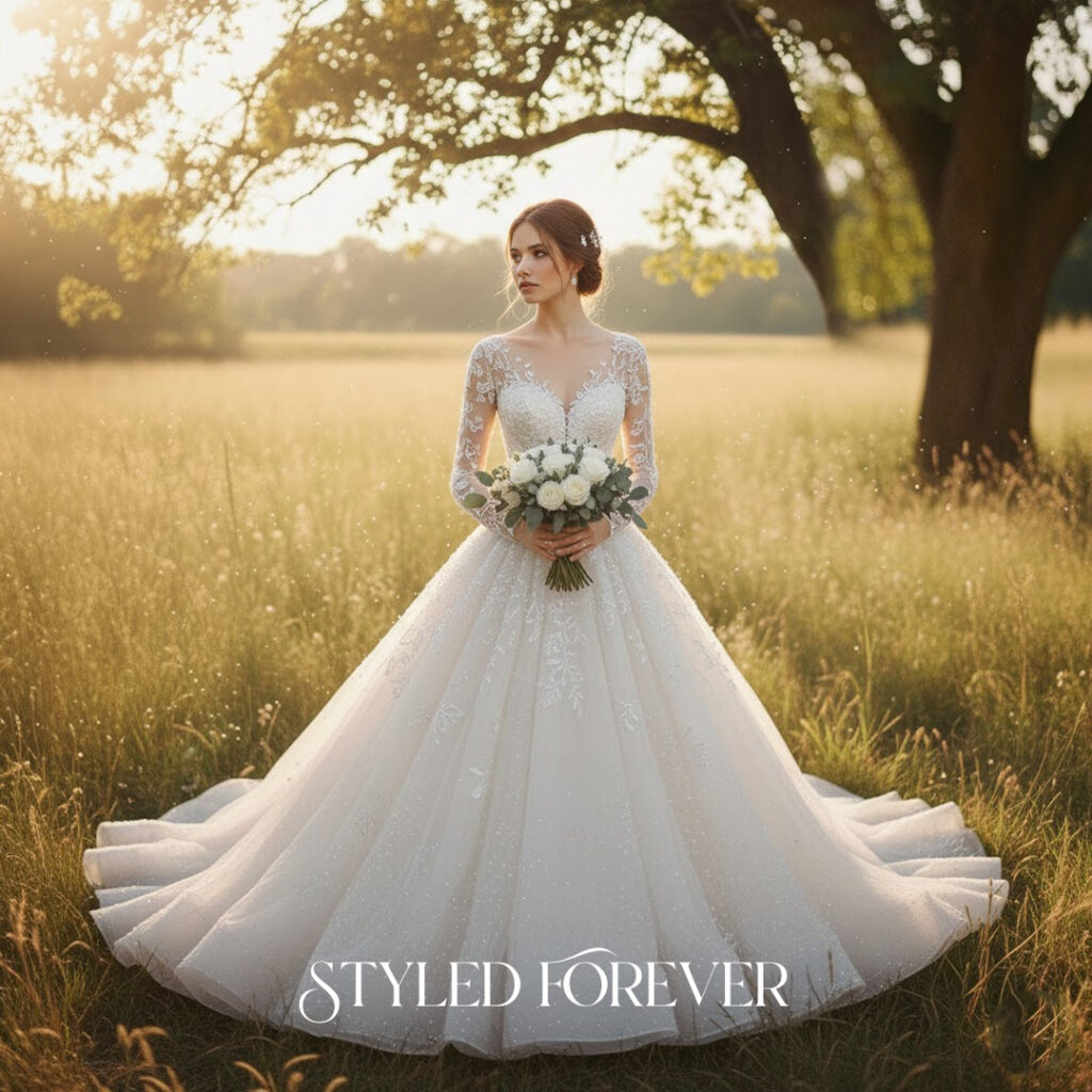 Sheer long sleeves with delicate detailing offer a calm, timeless presence. The look feels steady, soft, and quietly regal. Paired with a full skirt, the gown becomes a peaceful fairytail moment—perfect for cool-season weddings.