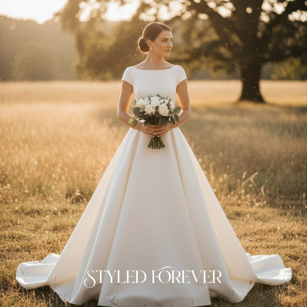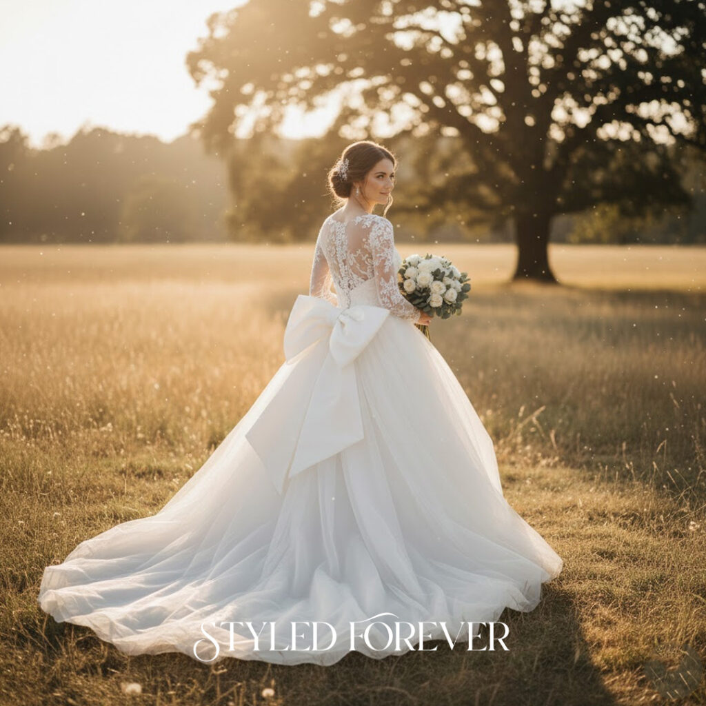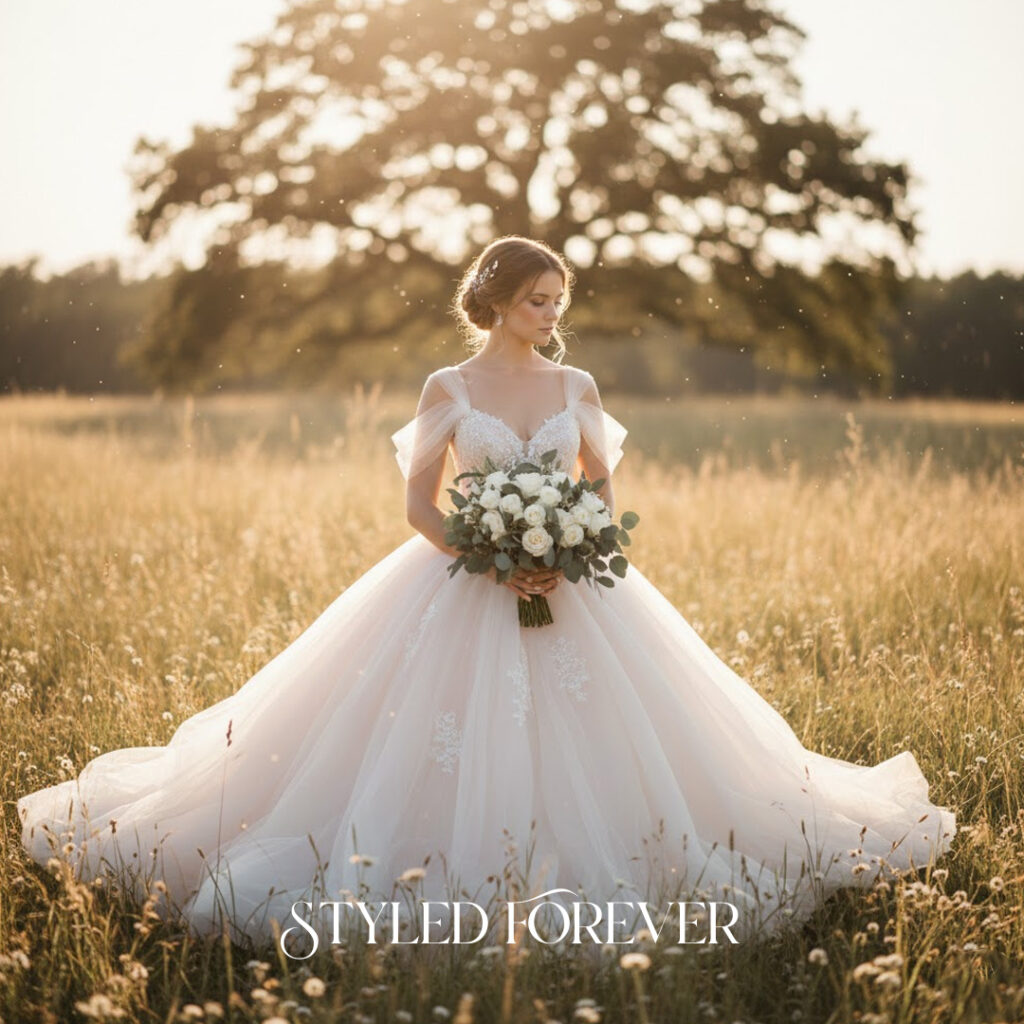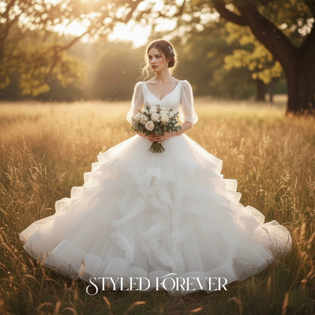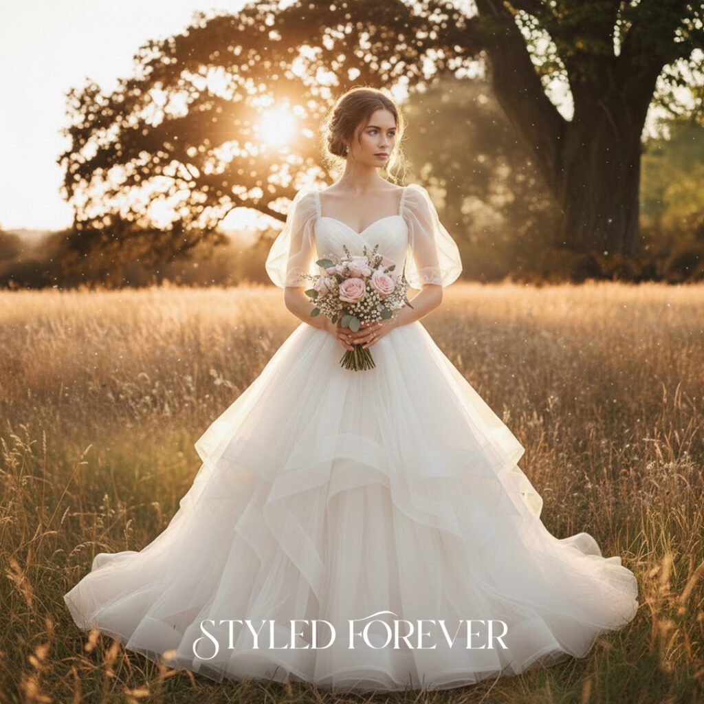 Light puff sleeves create a sweet, nostalgic silhouette. They add a youthful softness that feels straight out of childhood storybooks. This idea works beautifully for brides who love gentle fairytail whimsy.