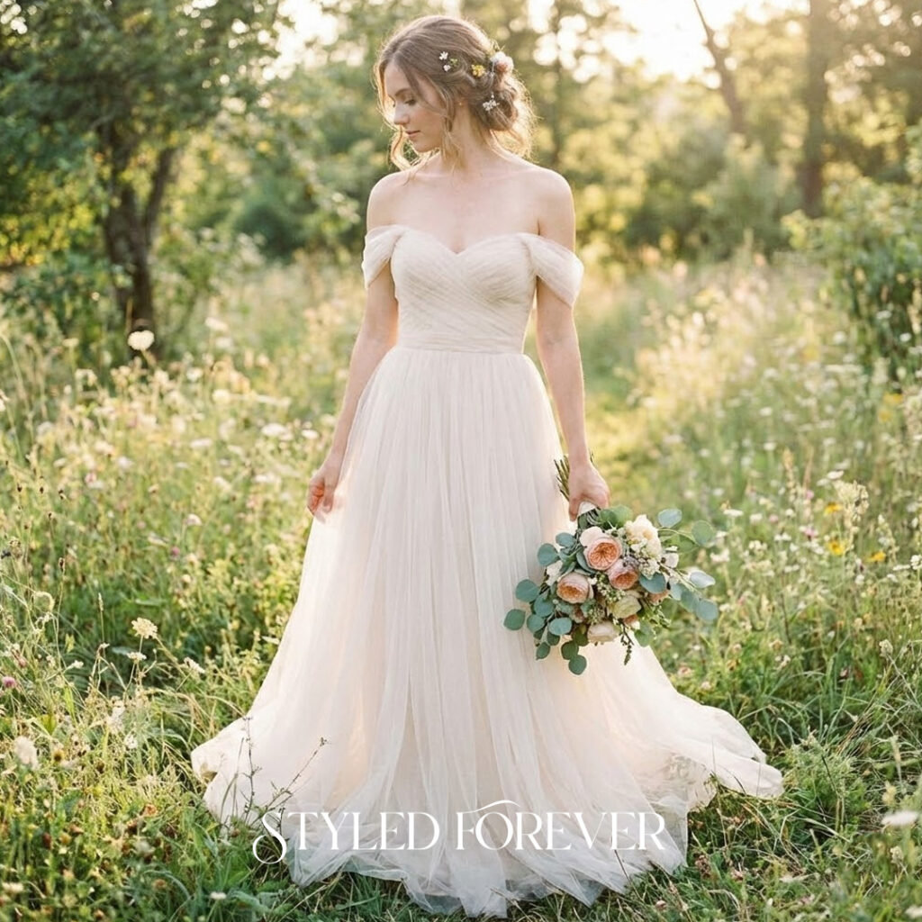The off-shoulder neckline holds a delicate kind of softness—almost like a breath resting along your collarbones. Paired with a flowing skirt, the look feels romantic and peaceful. It creates the impression of a bride who stepped out of a storybook meadow, carrying stillness with her. Ideal for anyone drawn to quiet elegance with a dreamy edge.