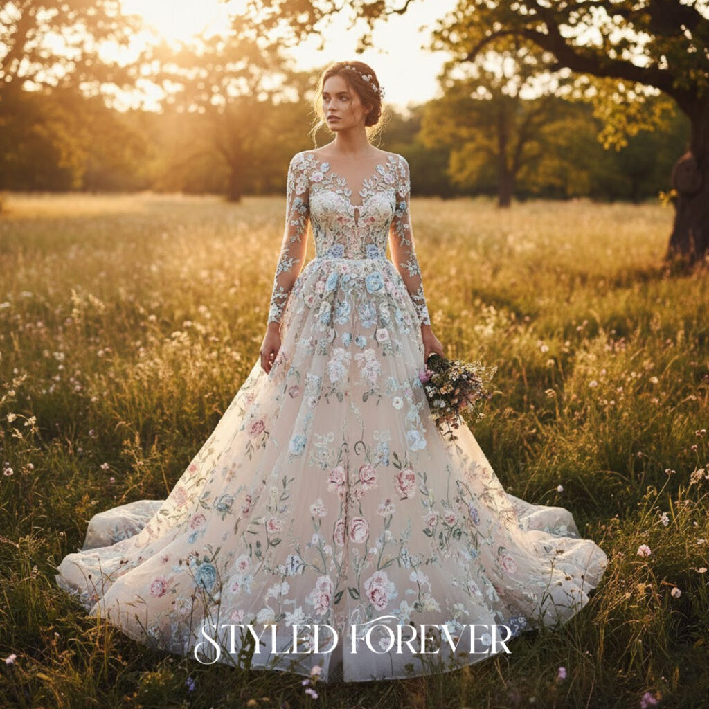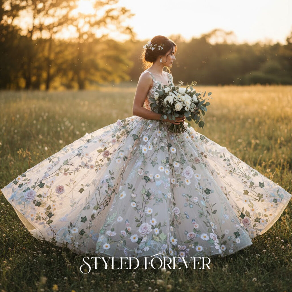 A voluminous skirt adorned with botanical patterns creates a natural fairytail moment. The dress feels like a moving garden—soft, airy, and poetic. This idea works beautifully for outdoor ceremonies.