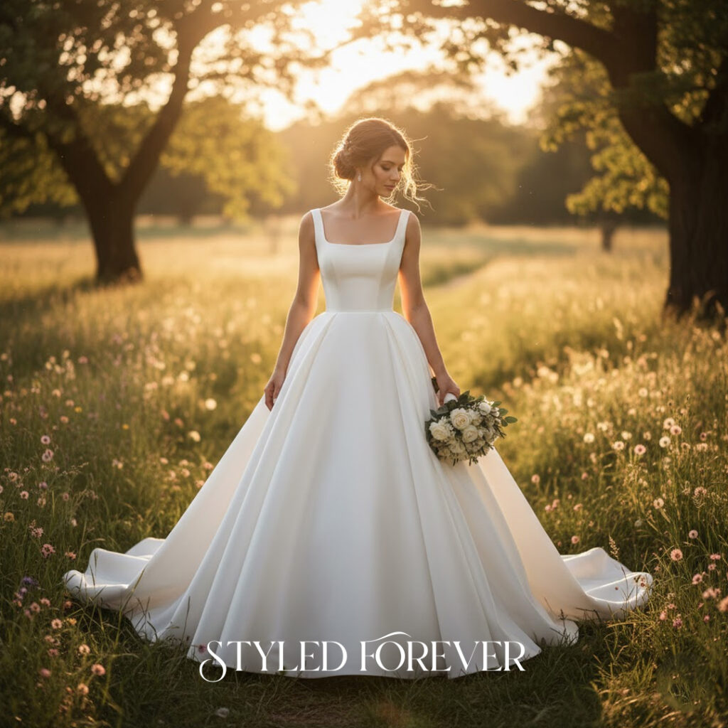 A clean, simple bodice paired with a soft, wide skirt creates a modern princess look. There are no elaborate details—just pure shape and quiet beauty. This style feels refreshing and poetic in its simplicity.