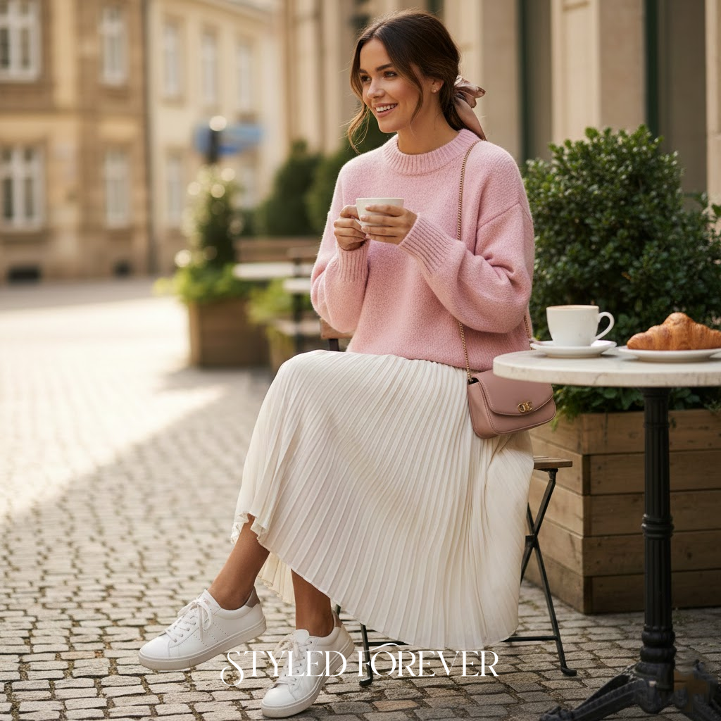 This outfit feels like the soft blush of new love. A cozy pink sweater paired with a gentle pleated skirt brings both sweetness and comfort. It’s the kind of look that makes you feel hugged all day. Perfect for a daytime date or a quiet café moment.
