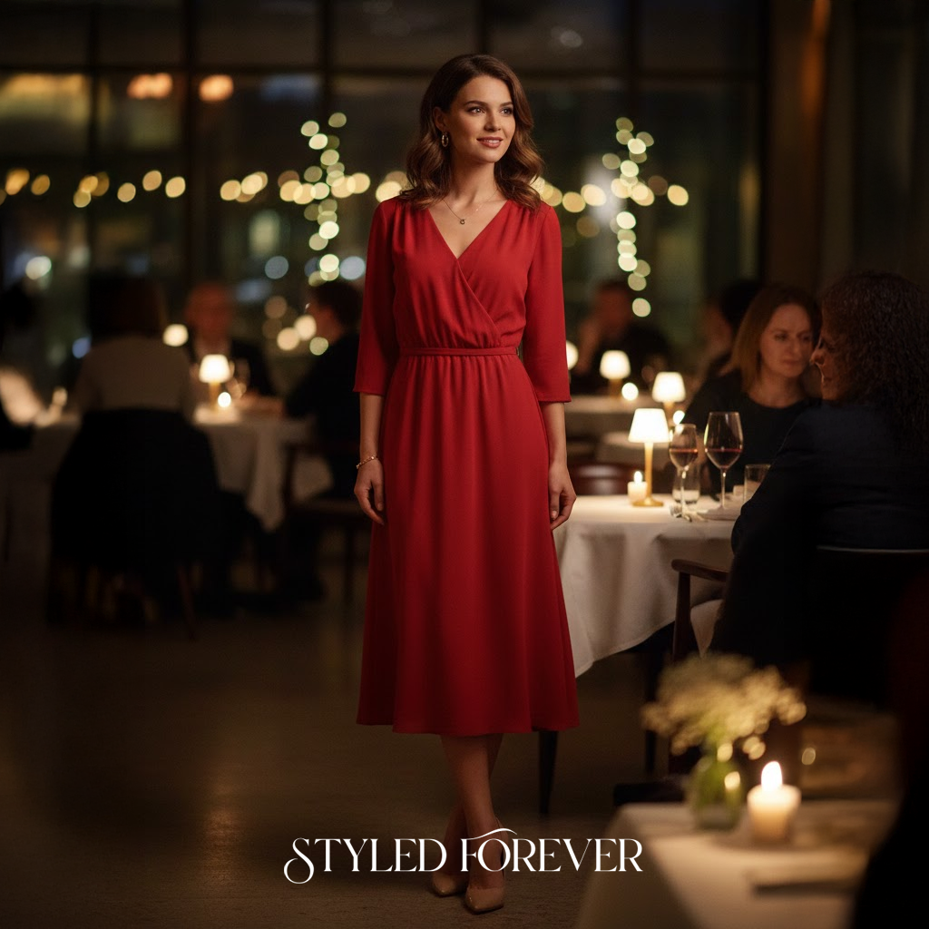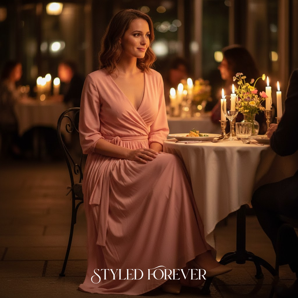 A wrap dress adds effortless charm. It moves beautifully as you walk and gives a quiet glow to your look. Perfect for candlelit dinners or sweet little surprises.