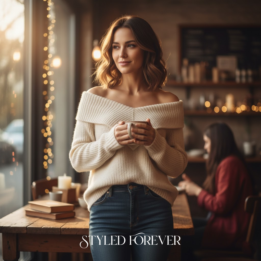 This outfit carries quiet beauty. The off-shoulder detail adds a little romance, while the jeans keep things grounded. A perfect blend of soft and confident.