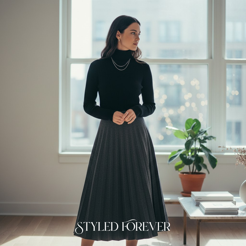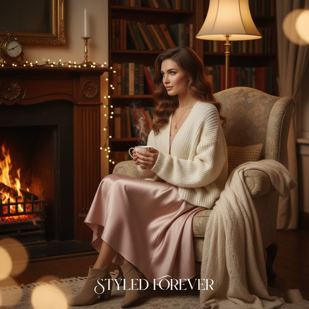 A gentle cardigan over a satin skirt feels like wrapping yourself in memories of cozy winters. It’s feminine, warm, and just shy of romantic. You’ll look lovely without trying too hard.